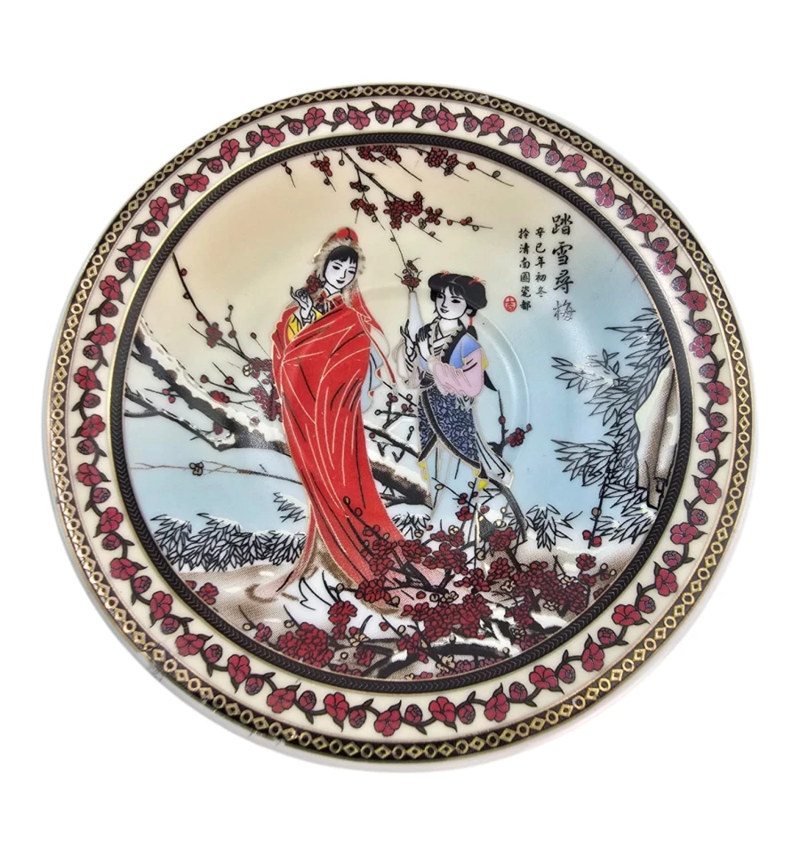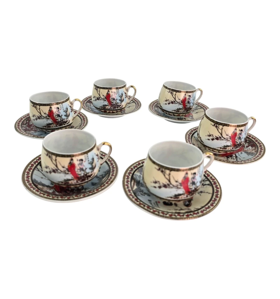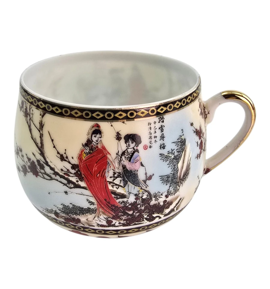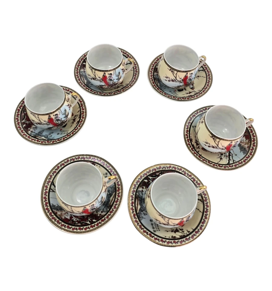 Каждая чашка и блюдце украшены классическим японским декором: девушки в кимоно на фоне зимнего пейзажа с цветущей сливой и красными птицами. Богатый золотой орнамент по краю на кремовом фоне.