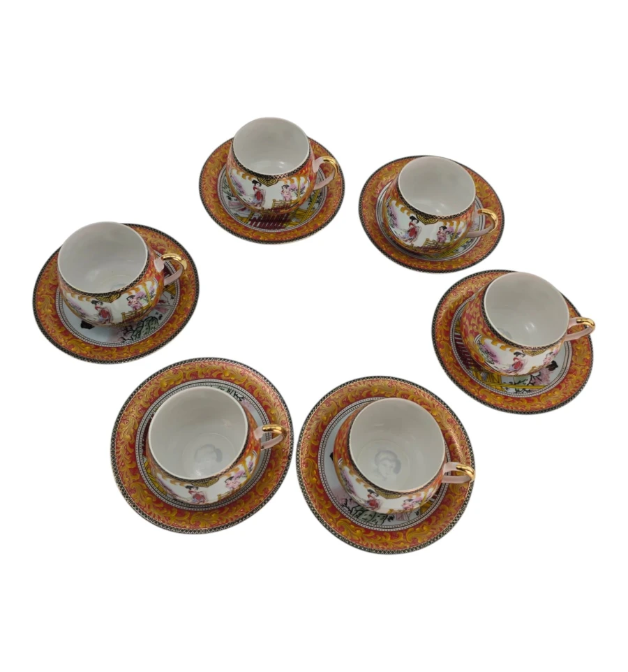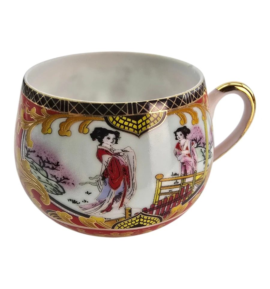 Каждая чашка и блюдце украшены роскошным японским декором на золотисто-бордовом фоне: традиционные девушки в кимоно на фоне пагод и цветущих деревьев. Богатый золотой орнамент по краю.
