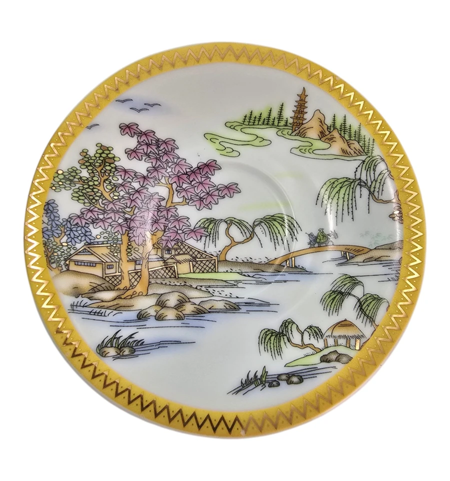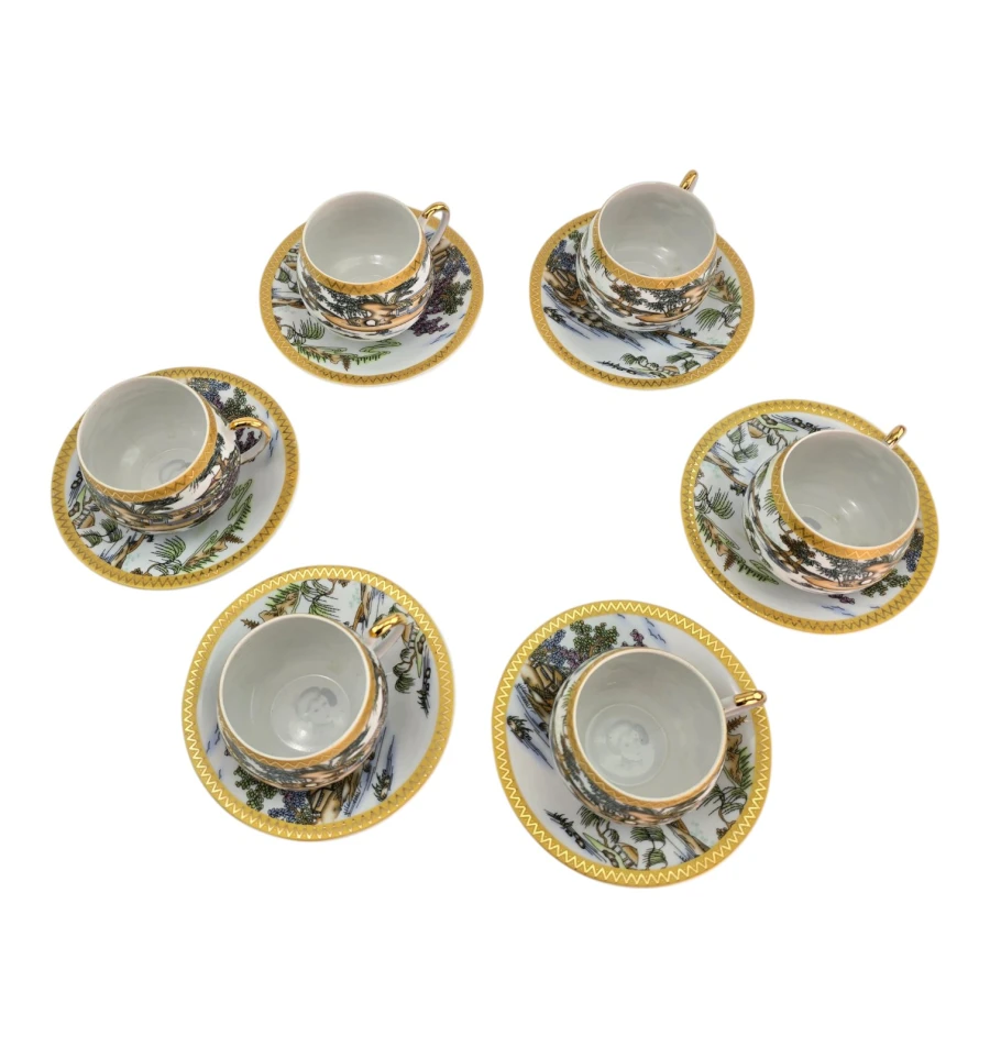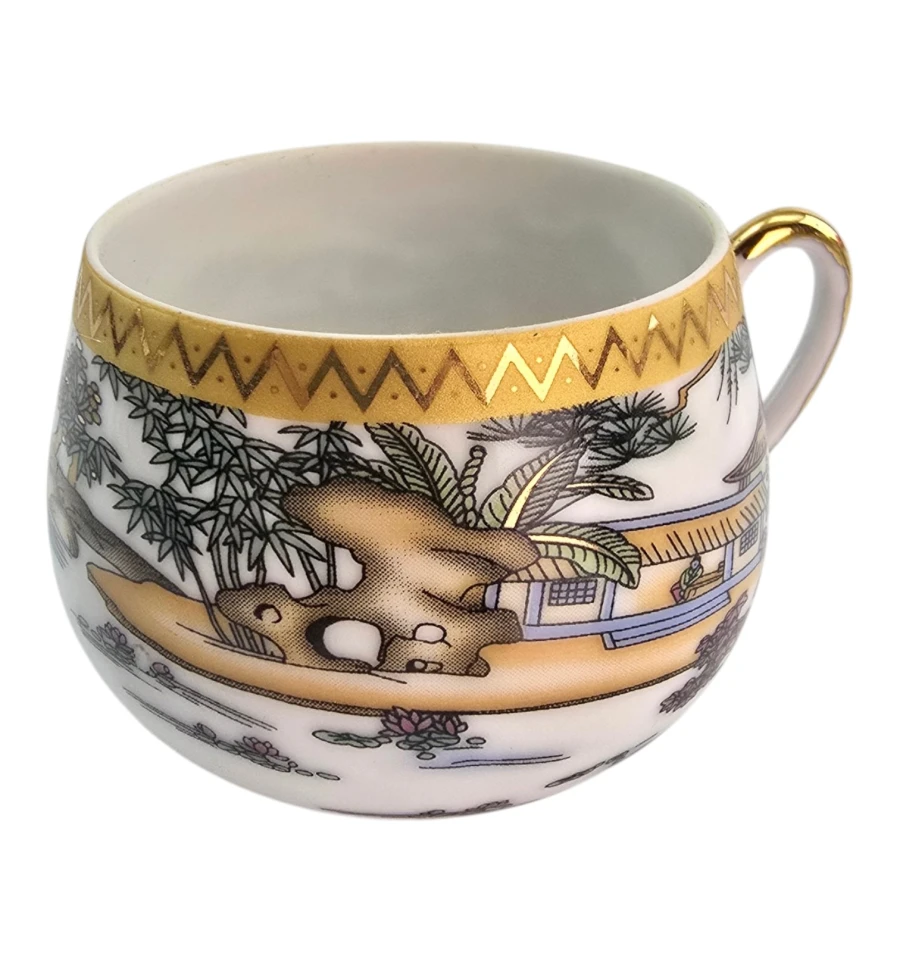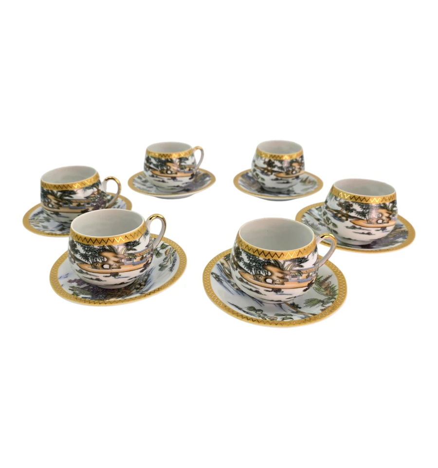 Каждая чашка и блюдце украшены классическим японским декором: традиционный пейзаж с домиками, соснами и цветущими деревьями. Богатый золотой орнамент по краю на белом фоне.