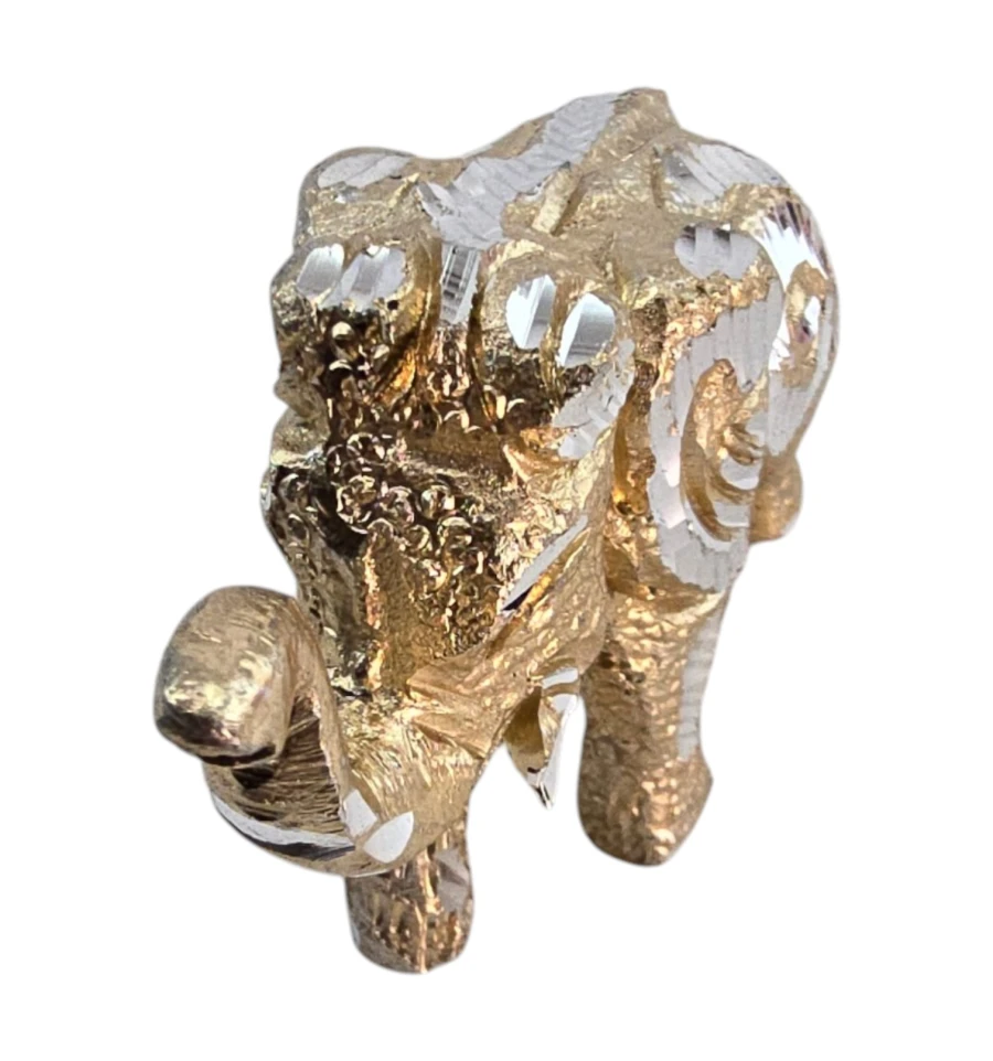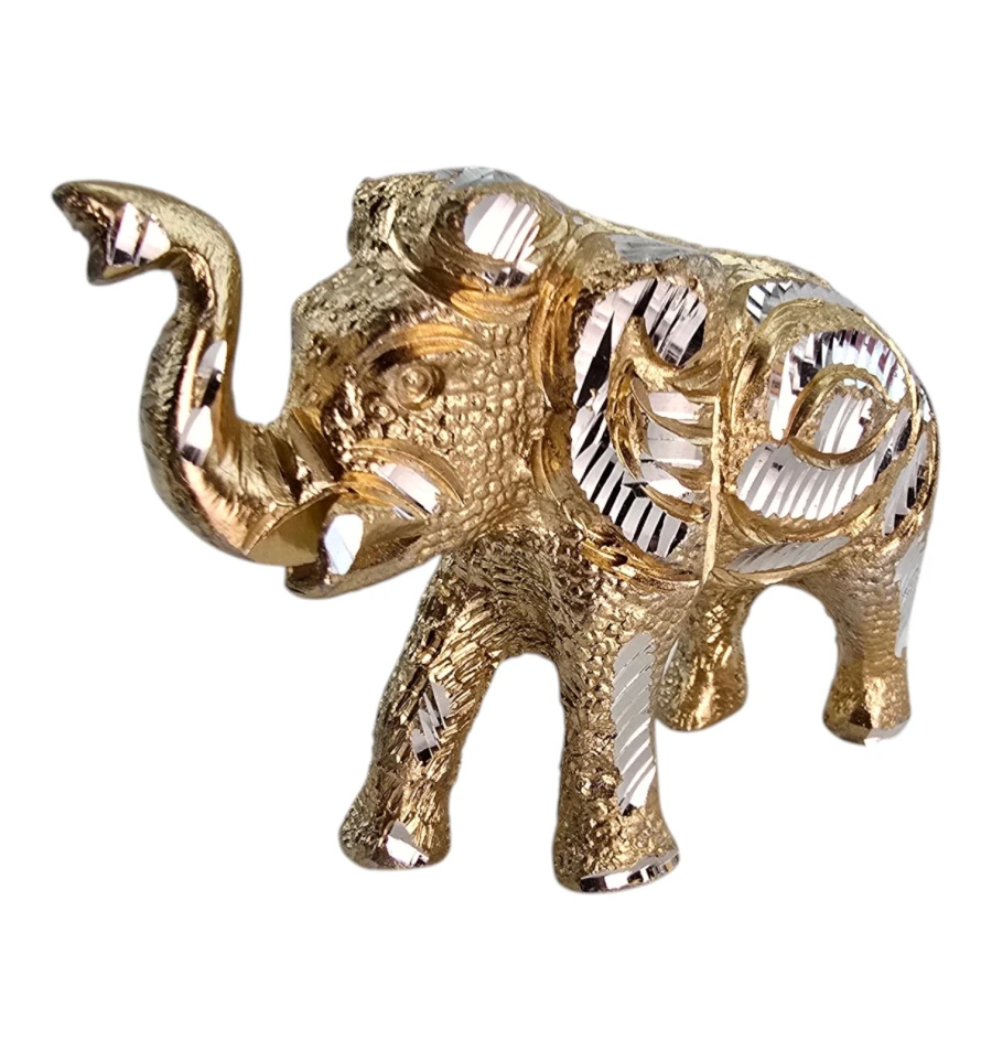 Слоник изображен в динамичной походке с поднятым хоботом — традиционный символ удачи, благополучия и защиты. Фигурка богато декорирована индийским орнаментом, имеет выразительную текстуру и блестящие зеркальные вставки, которые красиво отражают свет.