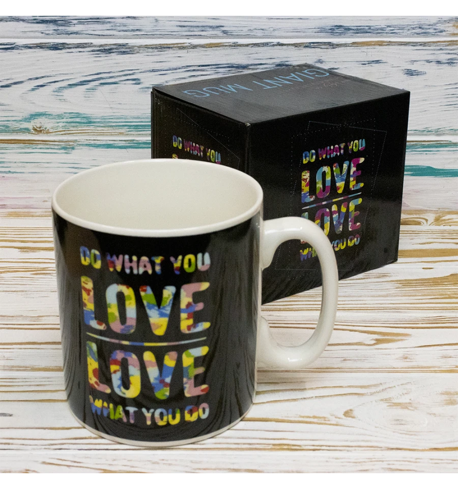 Любите пити чай чи каву? Але звичайної маленької чашки Вам мало? Набридло робити чай по кілька разів? Ми вирішили Вашу проблему. В інтернет-магазині PrazdnikShop, Ви можете купити Кухоль Гігант Роби те, що любиш. . . Do what you love. Це величезна чашка об'ємом 1 літр. Тепер чаю вистачить надовго. Влітку така чашка буде просто незамінною. Можна налити в неї холодний напій і тоді Вам не доведеться по кілька разів бігати на кухню і наливати воду знову і знову. У Вас є знайомий, який великий та високий. Тоді подаруйте йому цю чашку, сказавши для великих людей - великий гурток. Цей гурток буде оригінальним подарунком ще й завдяки своєму незвичайному та барвистим дизайну та душевній фразі англійською мовою Do what you love, яка перекладається як Роби те, що любиш. . .. Яскравий колір та якісний малюнок зробить процес чаювання більш приємним, і насолодитися улюбленим напоєм буде легше. Таку чашку можна подарувати своєму колегі в офісі. Важким, рано-вранці великий кухоль кави буде дуже доречним.