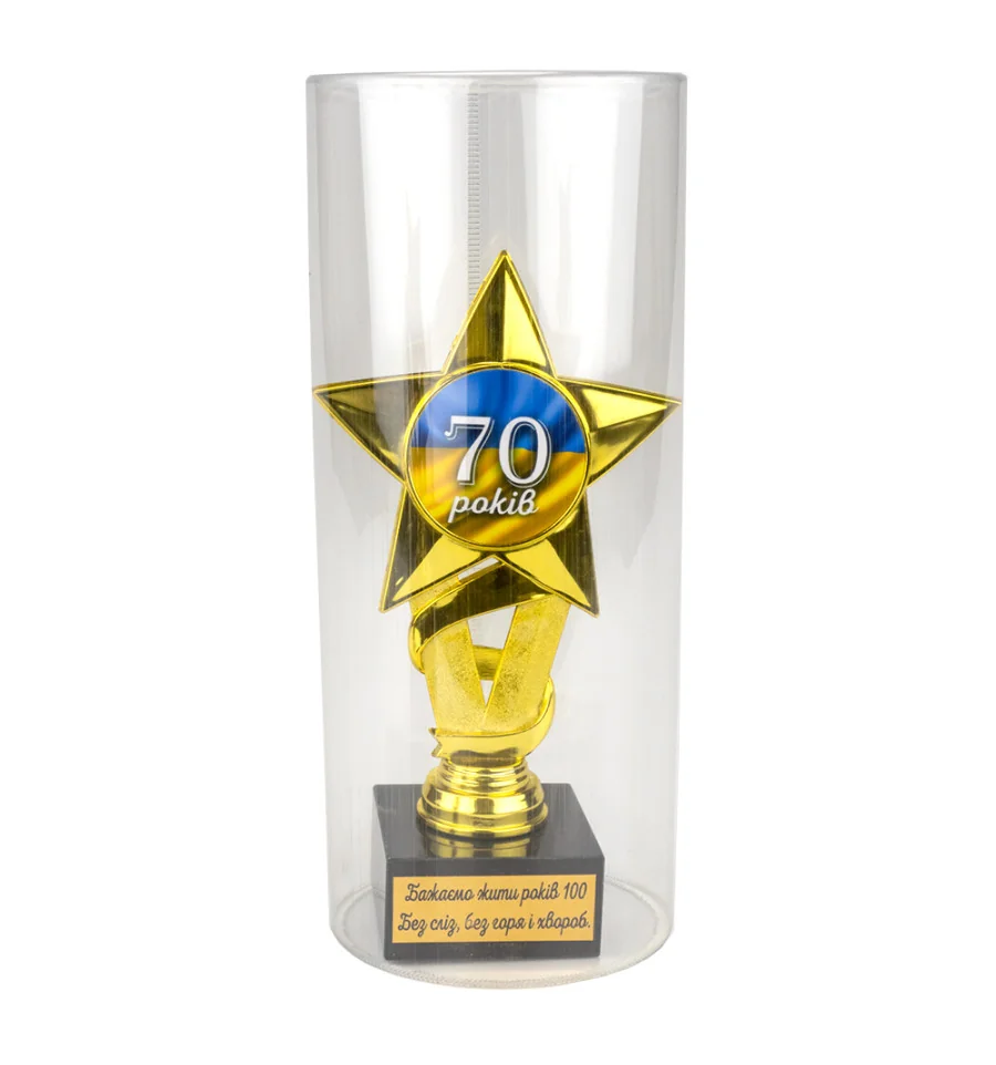 Шукаєте ідеальний подарунок на ювілей? Хочете здивувати і порадувати іменинника цього особливого дня? Не знаєте, що подарувати батькові, начальнику чи другу? У нас є рішення – статуетка Ювілейна! Статуетка на ювілей - це не просто сувенір, це символ вашої любові та поваги. Це оригінальний подарунок, що запам'ятовується, який викличе посмішку і радість у ювіляра. Статуетка виконана у вигляді великої зірки зі стрічками, із пластику з покриттям під золото на стійкій підставці з натурального каменю та витонченим написом на золотому фоні з вітанням українською мовою. Нажетон статуетки на синьо-жовтому фоні вказується знаменна дата. Статуетка упаковується в індивідуальний тубус з прозорого пластику. Унікальне пакування розроблене компанією PrazdnikShop. Не пропустіть свій шанс зробити ювіляру незабутній подарунок! Замовте статуетку прямо зараз на нашому сайті або зателефонуйте нашому менеджеру по телефону. Статуетка від PrazdnikShop – це подарунок, який оцінять усі!