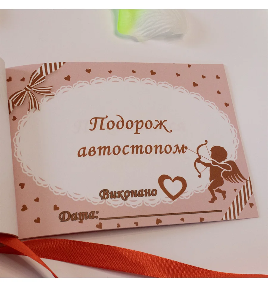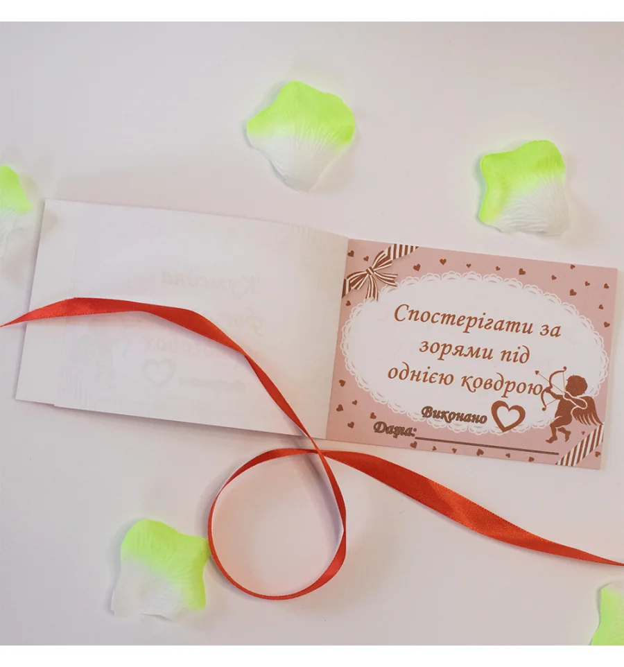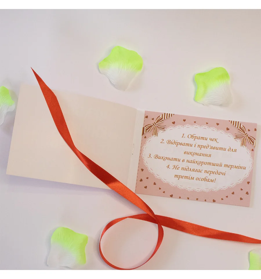 Чекова книжка бажань LOVE STORY (укр.) – найдорожчий подарунок, тому що Ви даруєте найбезцінніші речі Любов та Увага. Це чудовий та незабутній подарунок на будь-яке свято для Вашої половинки. З подарунком Чекова книжка бажань LOVE STORY (укр.) Ви внесете різноманітність, виконавши 15 простих, але водночас дуже приємних квестів чи бажань разом з половинкою у встановлений період. Книга складається з 16 сторінок, сторінки з детальною інструкцією з використання та 15 дизайнерських купонів з бажаннями все російською мовою. Наприклад – вечеря на даху, зустріти світанок у незвичайному місці, пікнік у парку та багато інших. Ви з коханою людиною вибираєте купон з бажанням і разом його виконуєте. Крім чекової книжки. Ви можете придбати солодкий сюприз та оригінальний подарунок 100 та Одна Причина у нашому інтернет магазині PrazdnikShop. Купивши Чекова книжка бажань LOVE STORY (укр.), ви отримуєте не тільки якісний товар, а й 100% позитивних вражень від придбання.