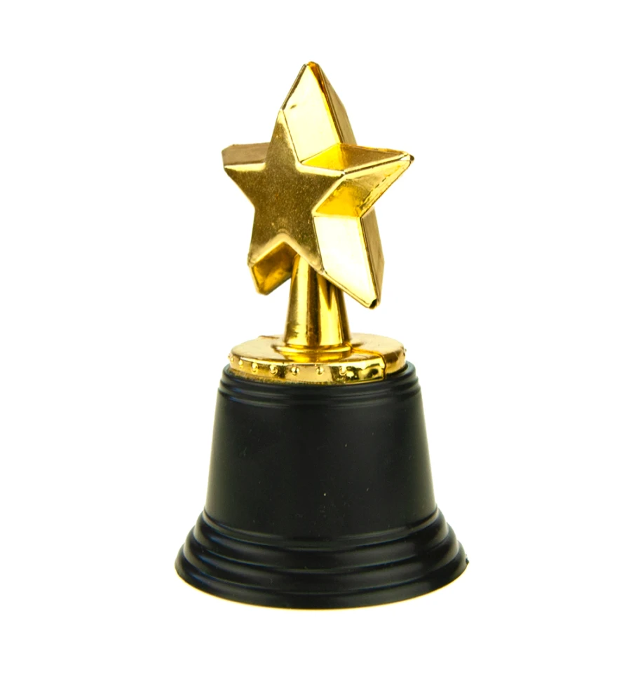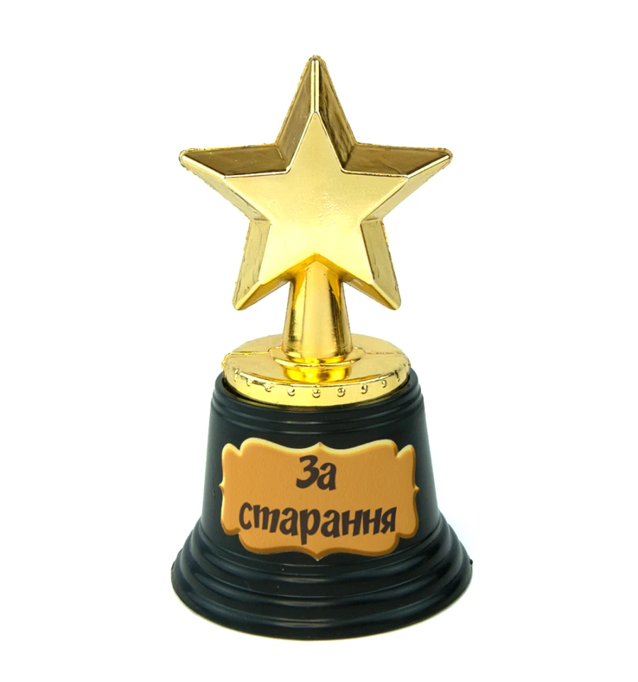 Статуетка 570940 Зірочка За старання з написом українською мовою: За старання – ідеальний сувенір для заохочення старань дитини, для учнів початкової школи чи дитячого садка. Може виступати як повноцінна нагорода в номінації: За старання або бути втішним призом. Статуетка виконана у вигляді зірки з щільного пластику з покриттям під золото та стійкою підставкою, такий сувенір стане чудовою прикрасою інтер'єру та подарунком, що запам'ятовується. На статуетках Зірочка можуть бути виробничі отвори, що виникають у процесі формування або лиття. Отвори малі та знаходяться в тих місцях, де не впливають на загальний вигляд виробу. Фото прикладу можна переглянути у галереї. Статуетка виготовляється на замовлення. Обміну та поверненню не підлягає. Наша компанія пропонує великий вибір статуеток і до деяких моделей можливе виготовлення індивідуального друку напису на табличці для п'єдесталу Кубків та Статуеток (колір тексту – чорний, фон – золотий) або на жетоні червоного зеленого чи синього кольору. Можливість виготовлення індивідуального друку необхідно додатково уточнювати у менеджера. Наш магазин пропонує товари оптом та для дропшиперів.