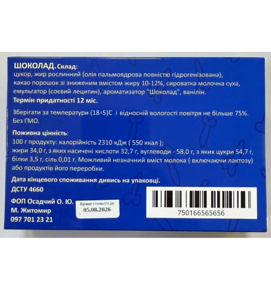 Розмір упакування: Ширина 10 см, Довжина 17 см, довжина шоколадки 5 см