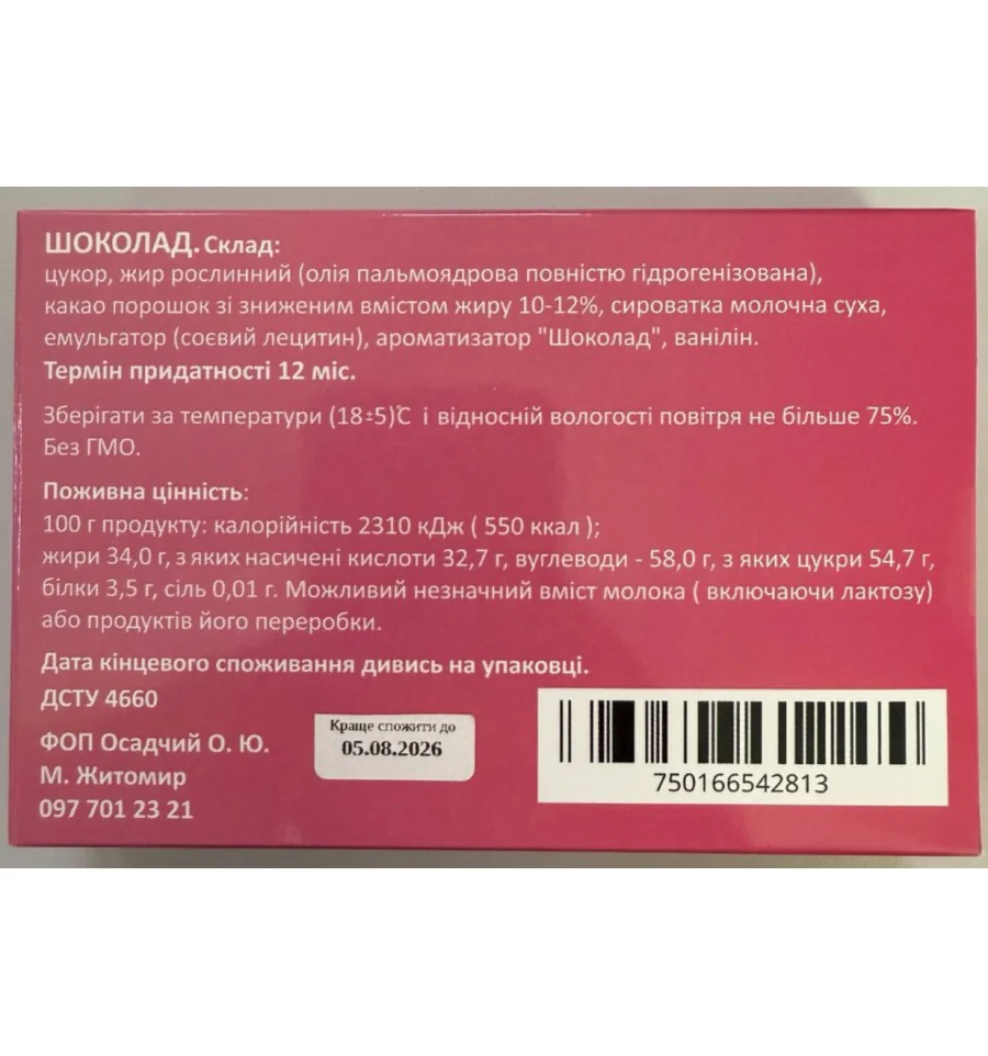 Шоколадний подарунок виготовляється з українського чорного шоколаду (не гіркий).