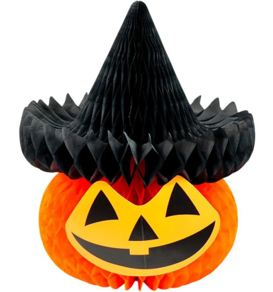 Оригінальна об'ємна прикраса на Хелловін у вигляді гарбуза з усміхненим обличчям і ковпаком відьми — яскравий акцент для святкового декору! Легкий, барвистий і зручний в установці, він чудово підійде для оформлення кімнати, вітрини, фотозони або столу.
