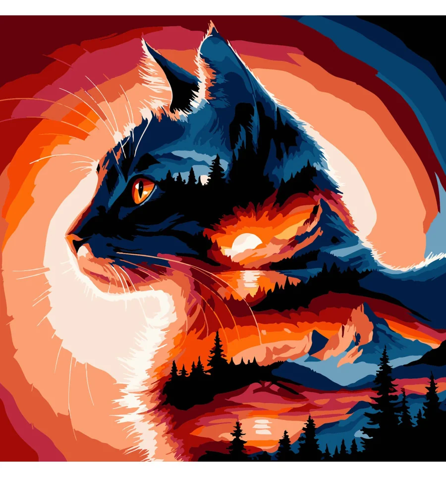 Картина за номерами ПРЕМІУМ Кіт на заході сонця на чорному фоні розміром 30х30 см (SH3030-25)Картини за номерами від українського виробника поєднують творчість з грою. Вони розвивають фантазію, покращують пам'ять і дрібну моторику. А процес малювання знижує тривогу і знімає стрес.