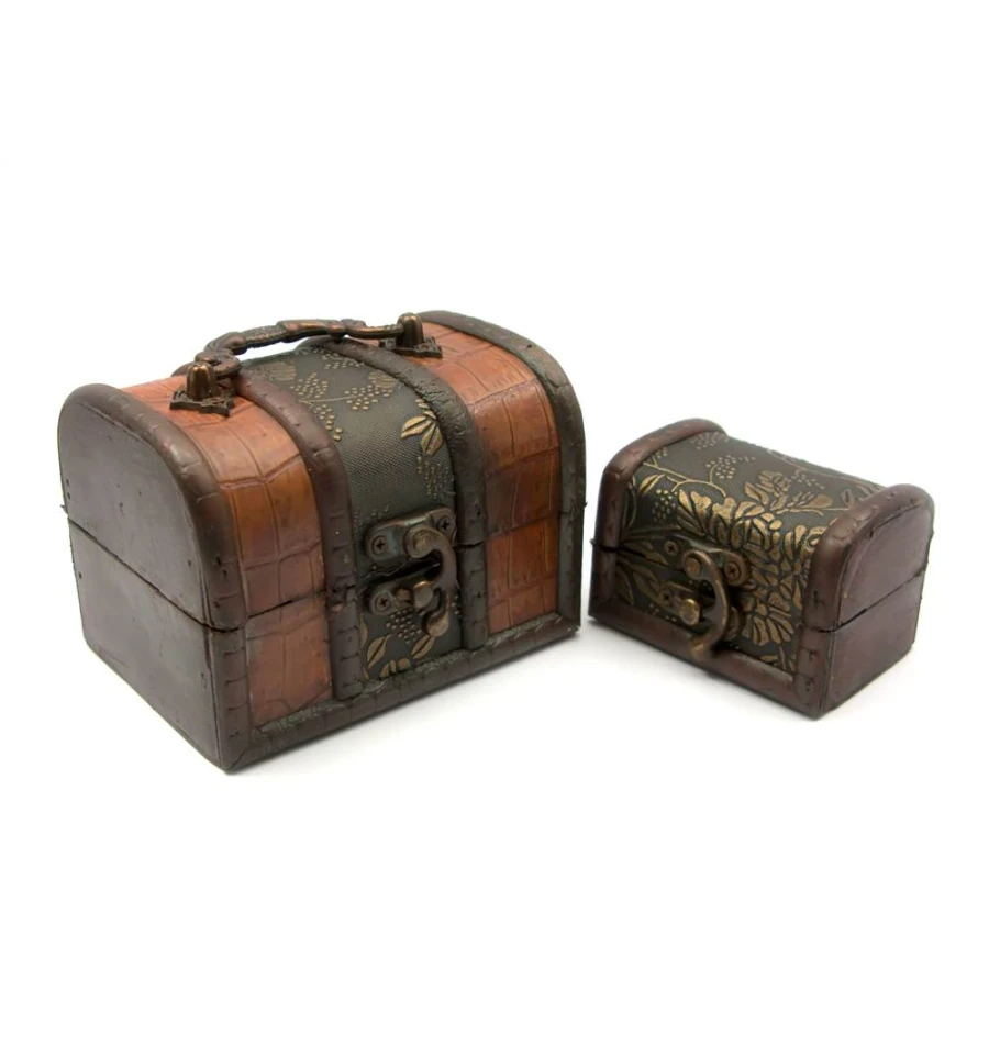 Відкрийте для себе вишуканий набір із двох скриньок у класичному стилі, який стане прикрасою вашого інтер'єру та чудовим місцем для зберігання цінних дрібниць. Ці скриньки, виготовлені в Китаї, поєднують у собі вінтажну естетику та функціональність, підійдуть для зберігання прикрас, пам'ятних речей або невеликих аксесуарів.