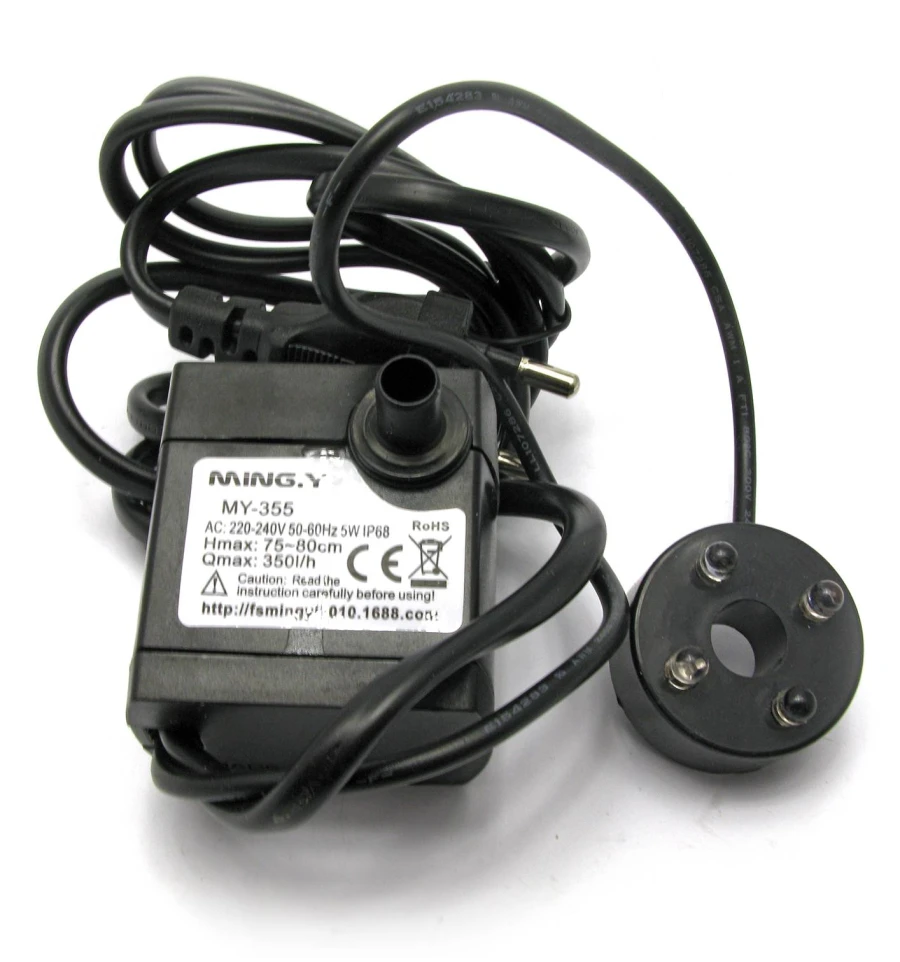 У нас є насос для фонтану з підсвічуванням. Цей насос має потужність 5 ватів та продуктивність 350 літрів на годину. Максимальна висота підйому води становить 75-80 сантиметрів.