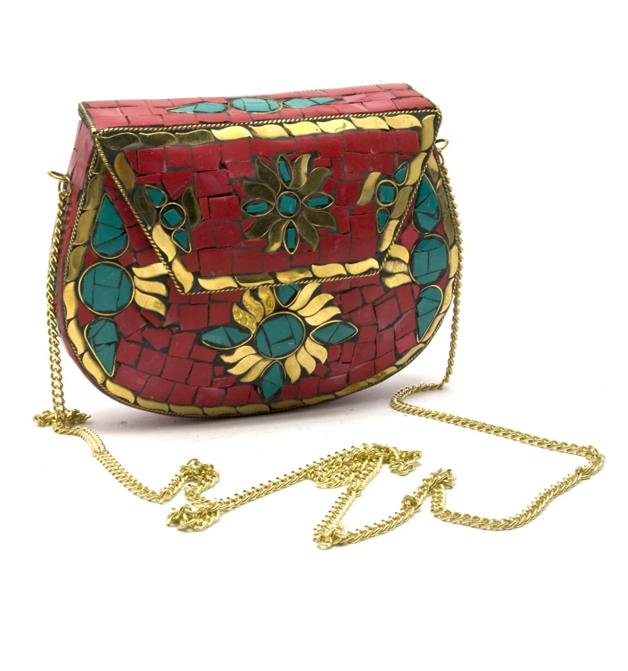 Ця вишукана сумочка виготовлена в Індії та прикрашена красивою інкрустацією з бронзи, коралів, бірюзи та латуні, яка надає їй розкішного та екзотичного вигляду.