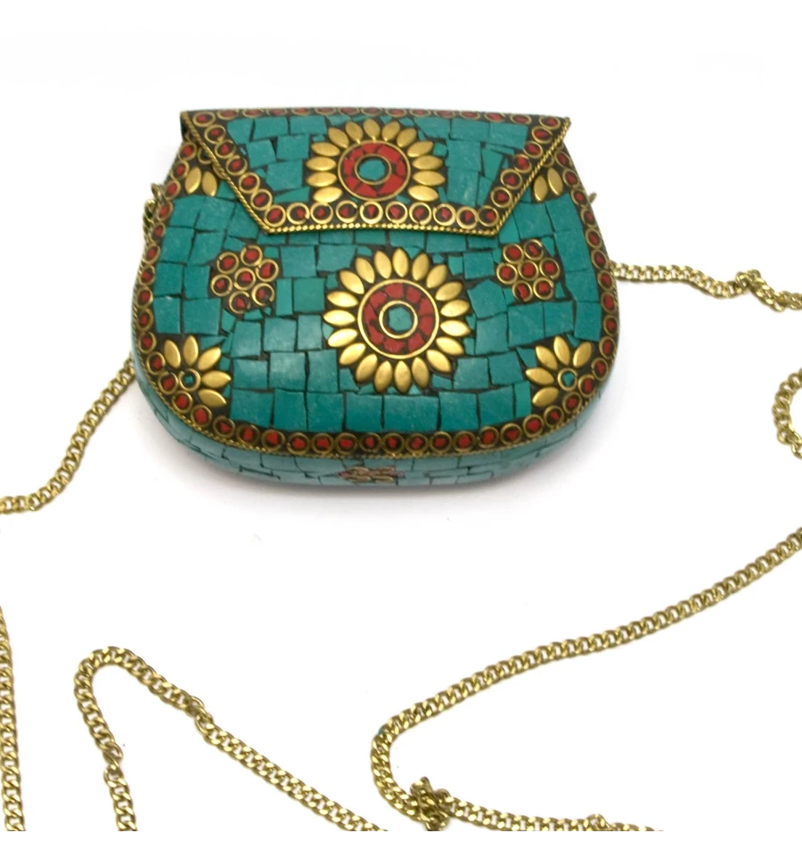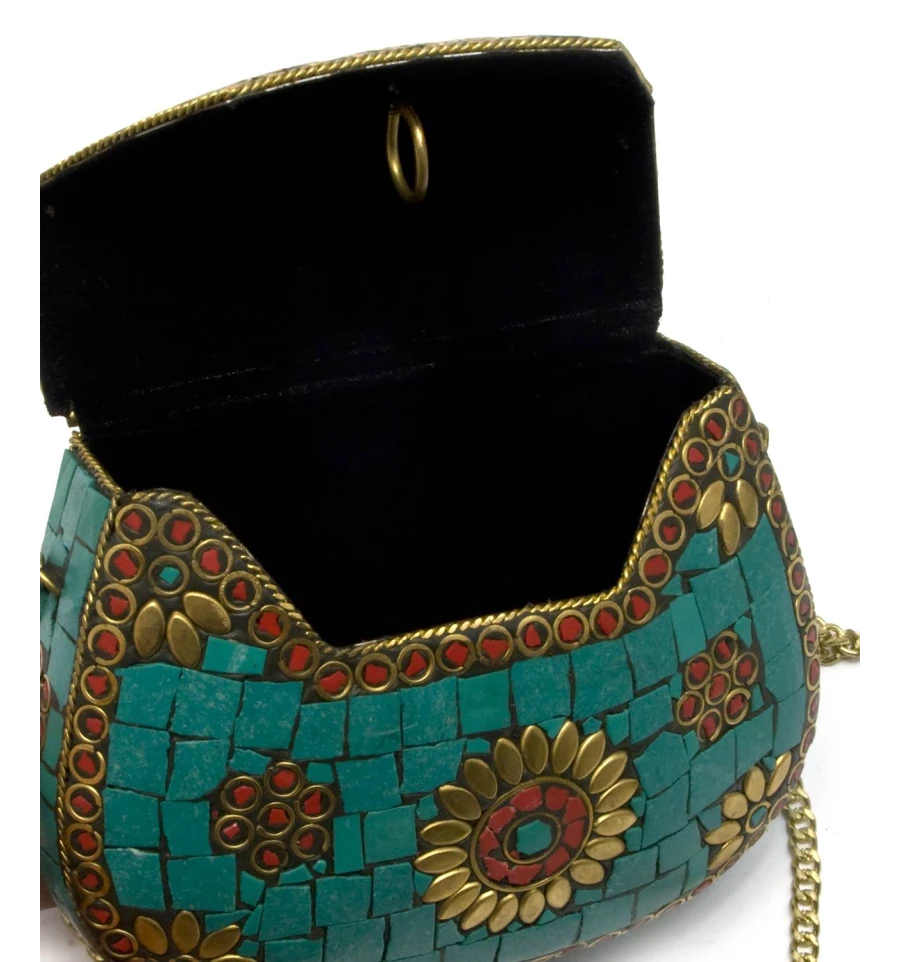 Сумочка бронзовая с кораллами и бирюзой зеленая (13.5×10×5 см)