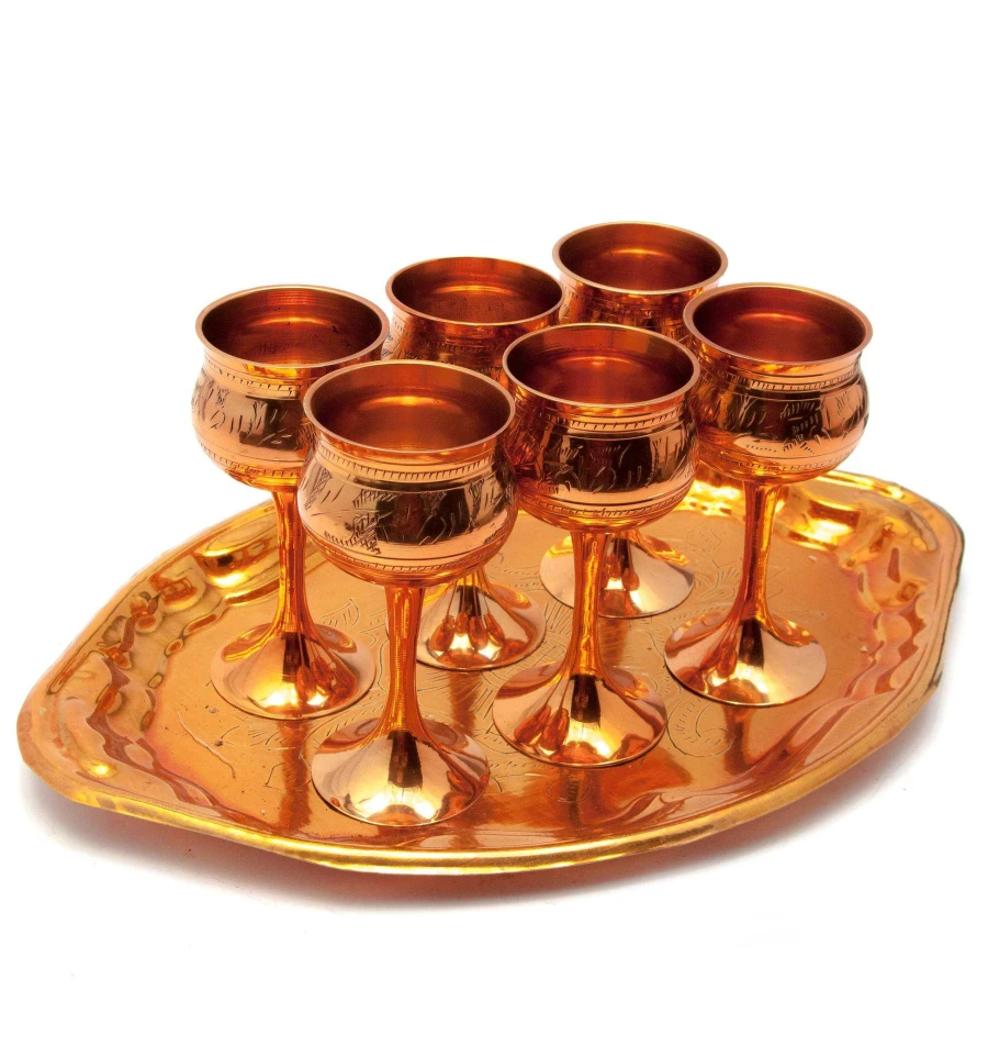 Рюмки бронзовые на подносе «Медь» (н-р 6 шт.) (h-13 d-5.5 см)(80мл) (поднос 30×20×1 см) купить в интернет магазине подарков ПраздникШоп