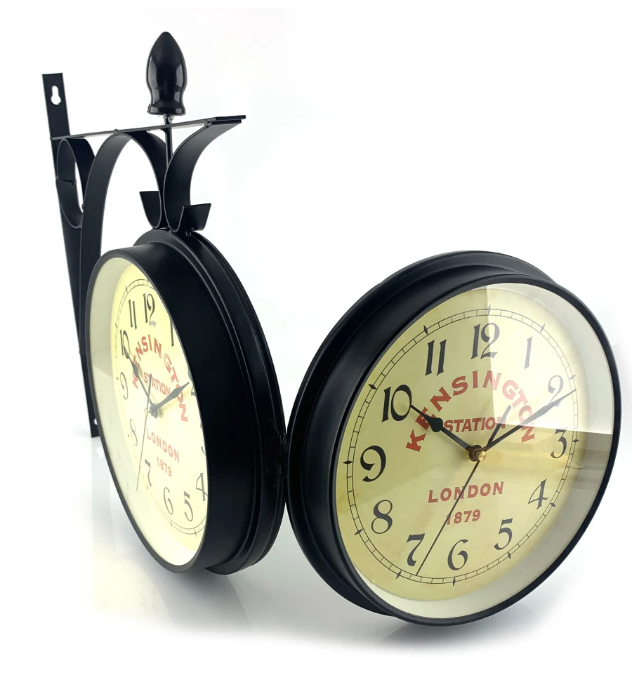 Представляємо вам двосторонній станційний годинник в чорному кольорі з написом "Kensington station LONDON 1879". Цей годинник - це не тільки практичний пристрій для відліку часу, але й чудовий елемент декору для вашого інтер'єру.