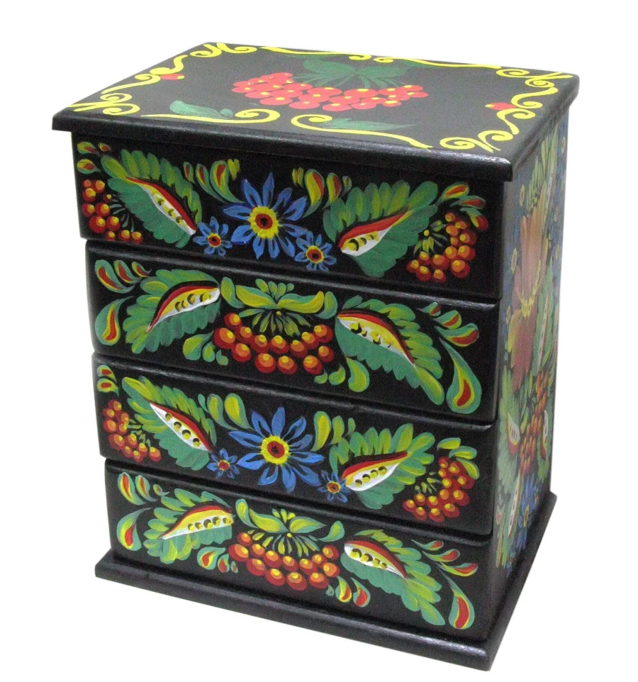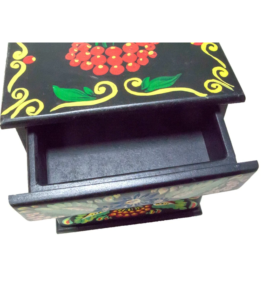 Скринька комод «Квіти з калиною», чорна, розписано вручну масив дерева (22.5×15×26 см)