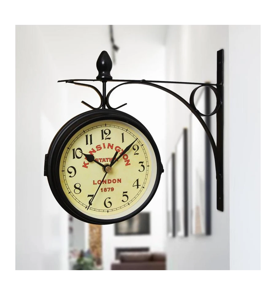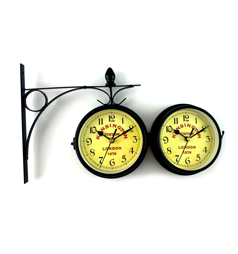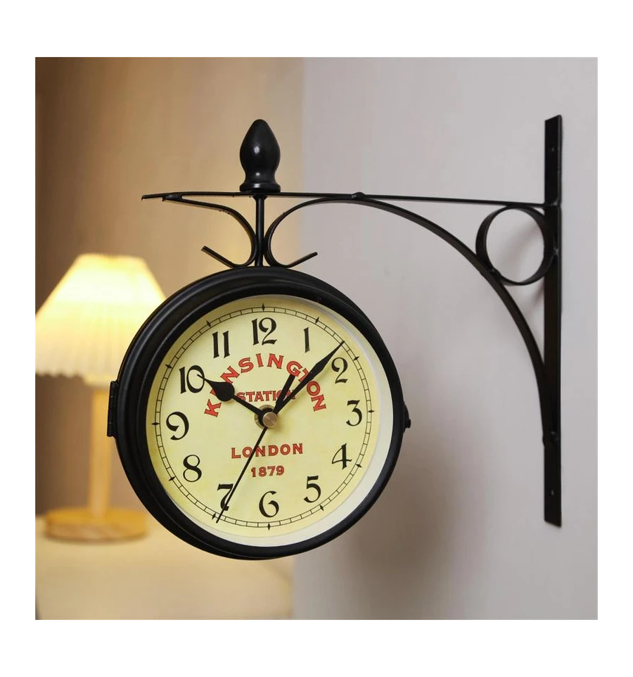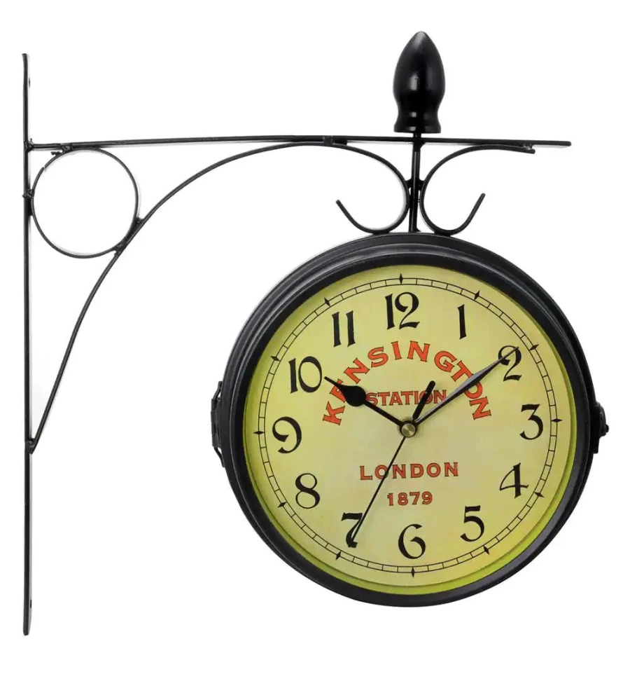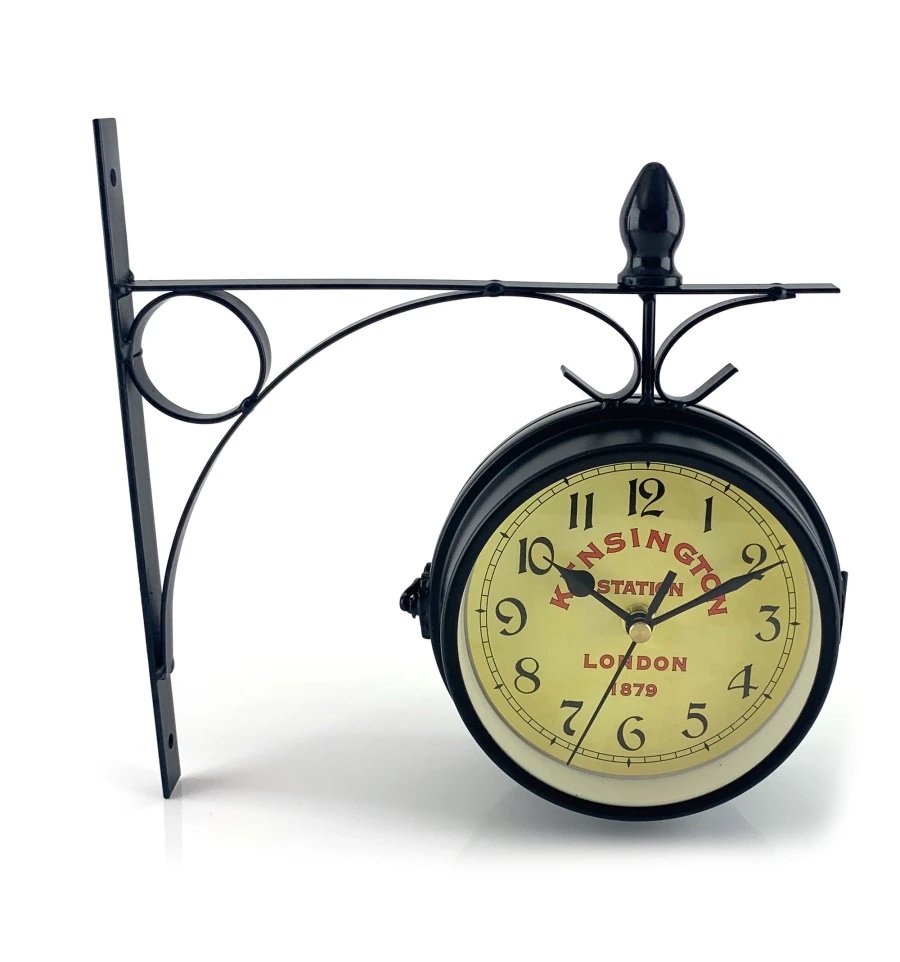 Представляємо вам двосторонній станційний годинник в чорному кольорі з написом "Kensington station LONDON 1879". Цей годинник - це не тільки практичний пристрій для відліку часу, але й чудовий елемент декору для вашого інтер'єру.