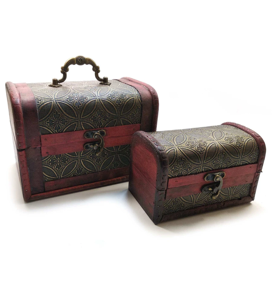 Зовнішня частина скриньок-скриньок у скрині 2 в 1 прикрашена орнаментом, що надає їй вишуканий вигляд. Кожна зі скриньок-скриньок має відкидну кришку, що робить їх функціональними та зручними у використанні.