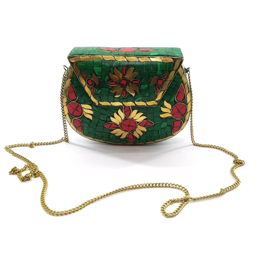 Ця вишукана сумочка виготовлена в Індії та прикрашена красивою інкрустацією з бронзи, коралів, бірюзи та латуні, яка надає їй розкішного та екзотичного вигляду.