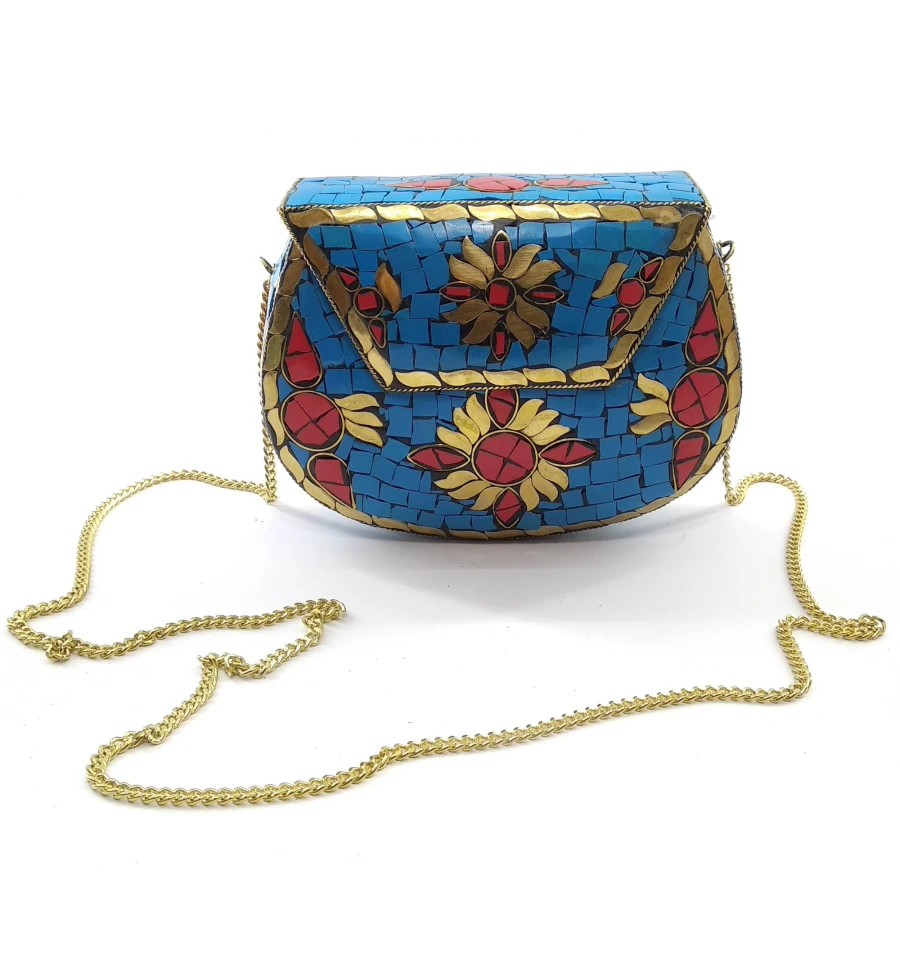 Ця вишукана сумочка виготовлена в Індії та прикрашена красивою інкрустацією з бронзи, коралів, бірюзи та латуні, яка надає їй розкішного та екзотичного вигляду.