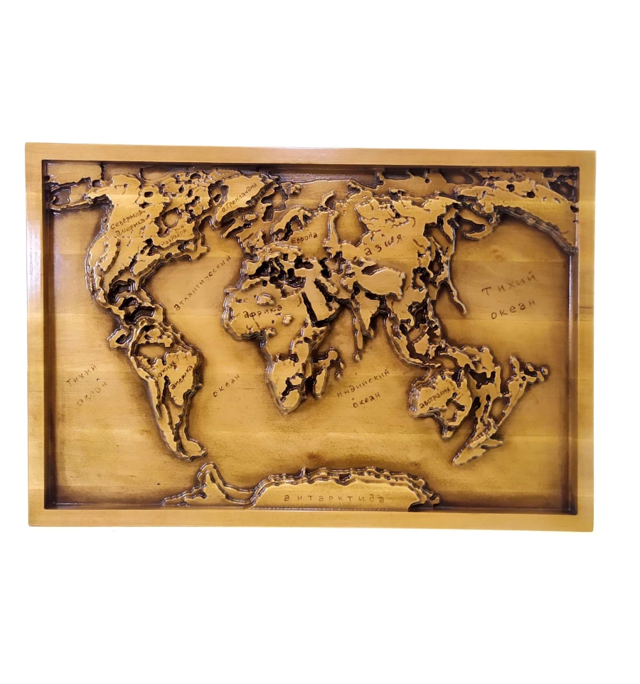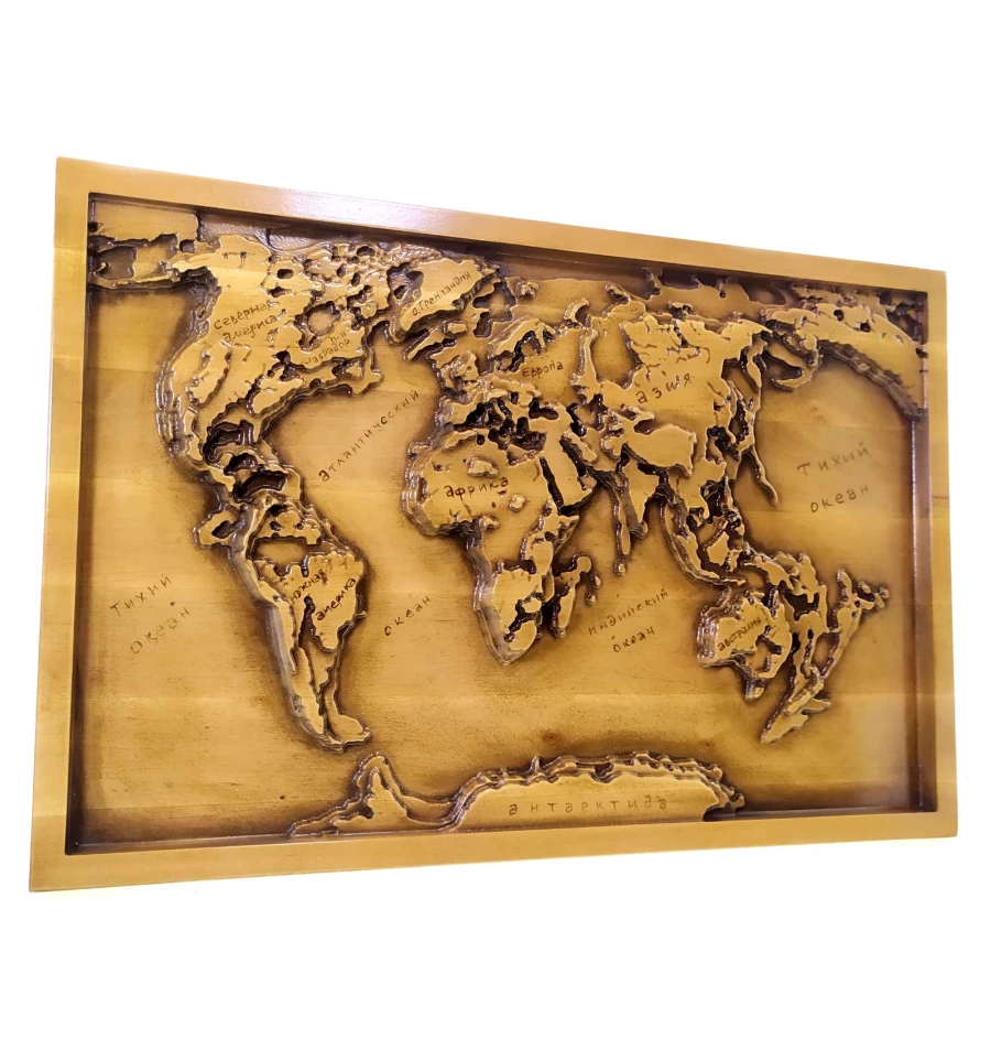 Панно «Карта світу» дерев'яне, різне, покрите патиною (43×29×2.5 см)
