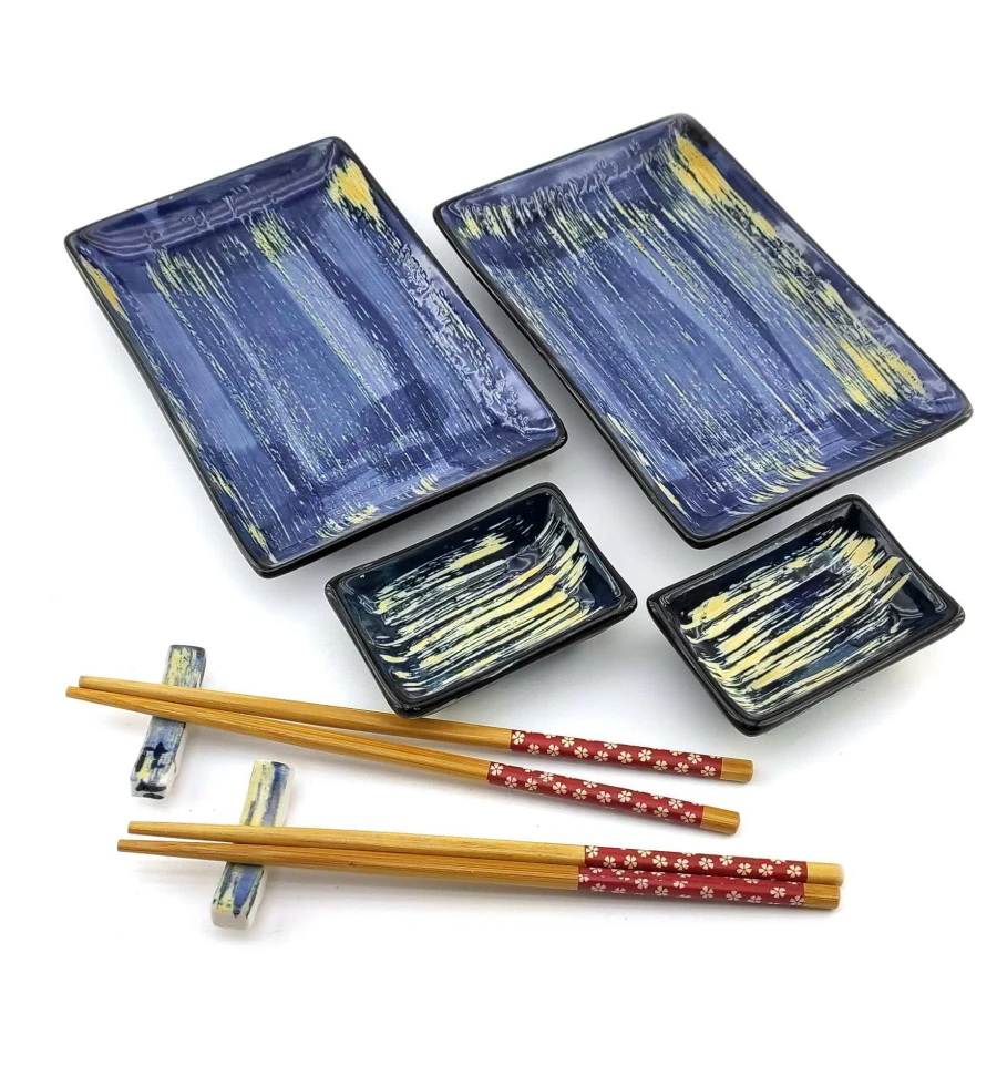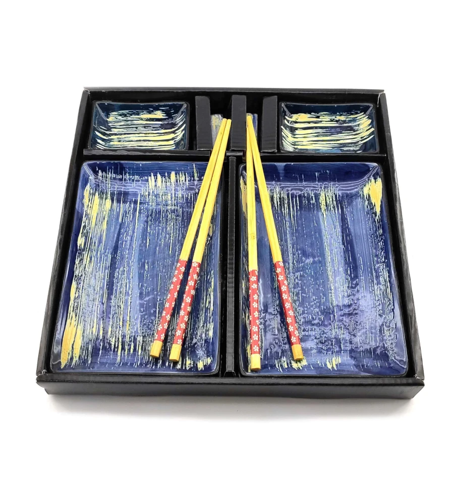 Набір для суші, ролів, сашимі ChiBone. Прекрасний набір для поціновувачів східної кухні. Набір розрахований на дві особи, в наборі дві керамічні тарілки прямокутної форми. Легкі та гладкі бамбукові палички, два комплекти, які не розмокають та не деформуються при правильному зберіганні. Дві керамічні підставки для паличок. Дві керамічні соусниці. Набір упакований у картонну коробку з пластиковою кришкою. Кожен предмет набору має свій окремий осередок для зручного зберігання. Склад набору: - тарілка (20 * 13 см) -2 шт. - Блюдце для соусу (9*6.5 см) – 2 шт. - комплект бамбукових паличок для суші. - 2 комплекти. - Підставка під палички (5.5*1 см) – 2 шт. - Подарункова картонна коробка (28*14*4см)