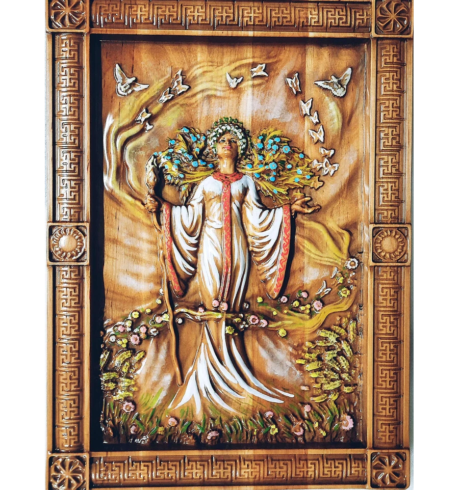 Панно "Жива" вкрите патиною, лаком та емалями, що не тільки захищає його від зовнішніх впливів, а й додає блиску та привабливості. Ці оздоблювальні матеріали підкреслюють красу дерева і надають йому ще більшої глибини та насиченості.