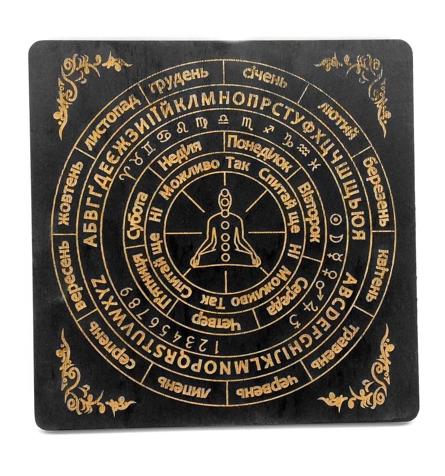 Класична таблиця для роботи з маятником – відмінний вибір для тих, хто займається духовною практикою та розвитком своєї свідомості. Ця таблиця виконана у темному кольорі, має розміри 26х26х0,8 см та виготовлена вручну з якісної дерев'яної заготовки.