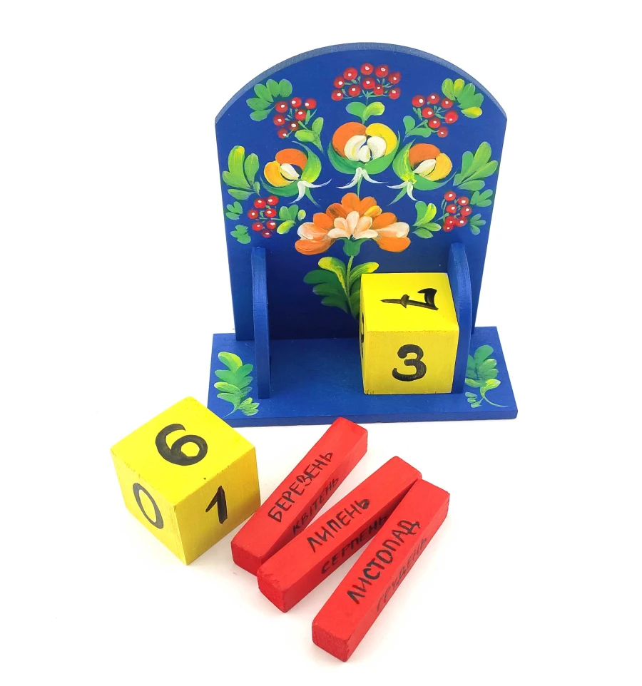 місяців розміром 80х14х14 мм. Розмір всього календаря складає 155х142х60. мм. Написи з назвами місяців виконані українською мовою.