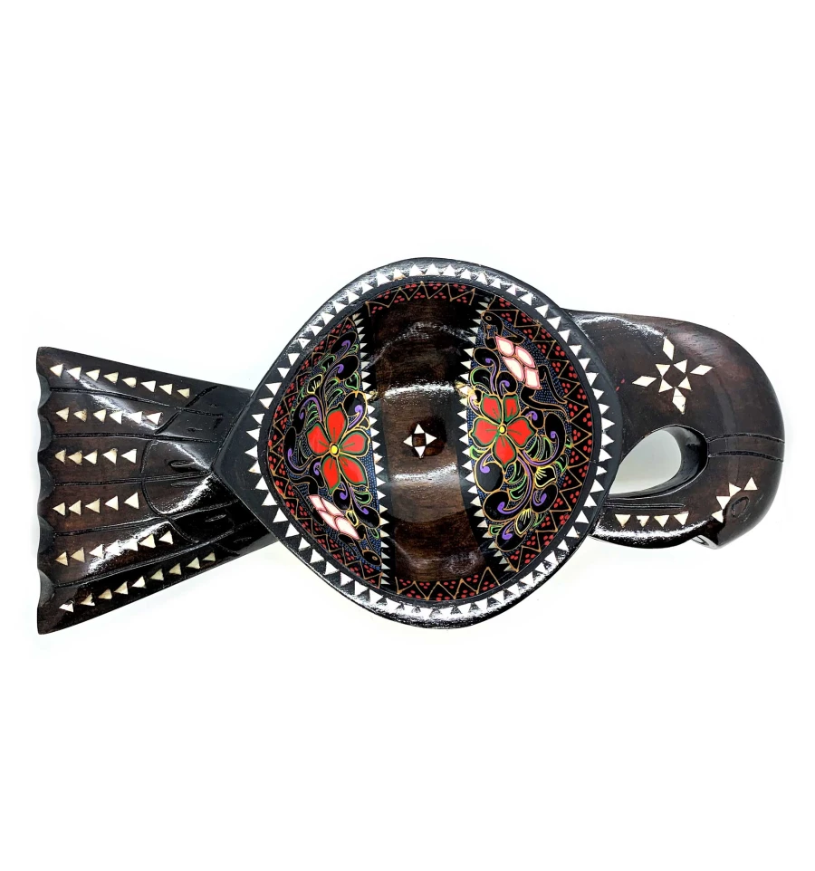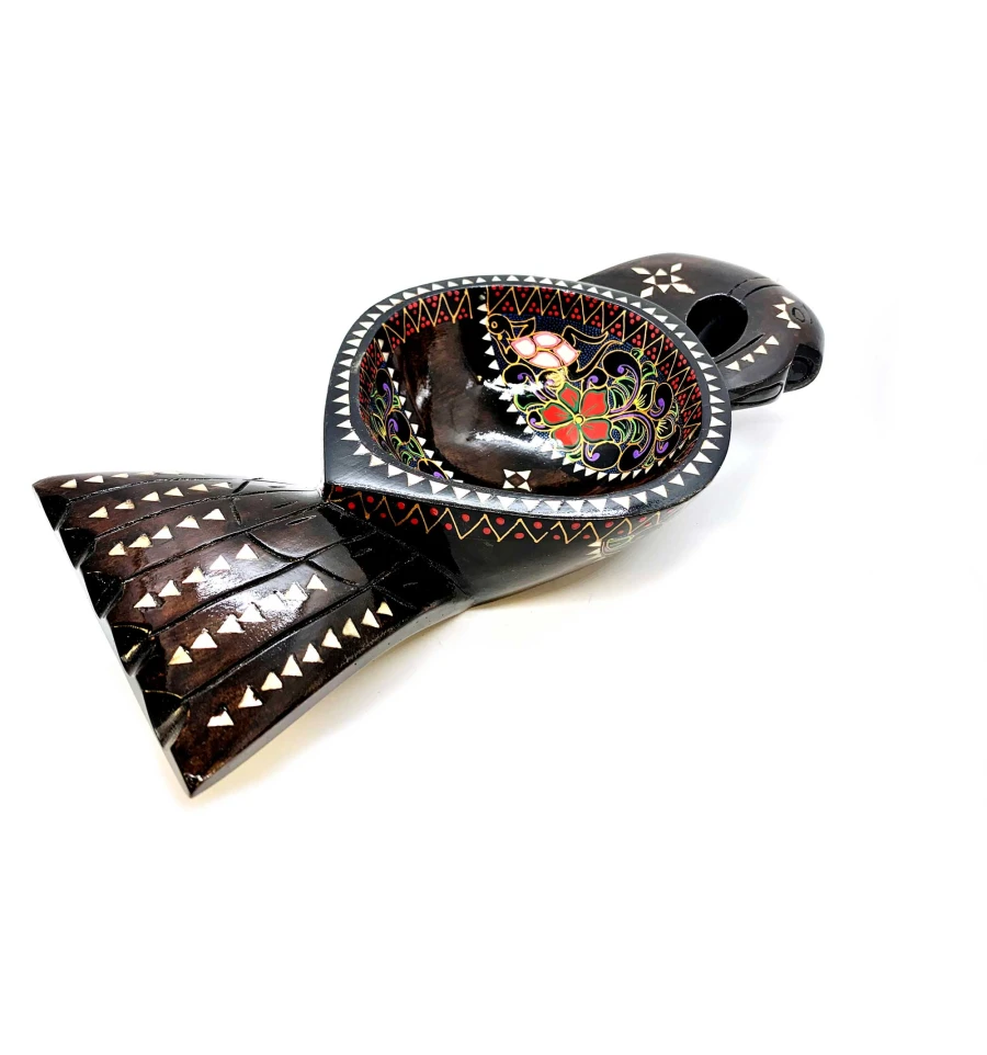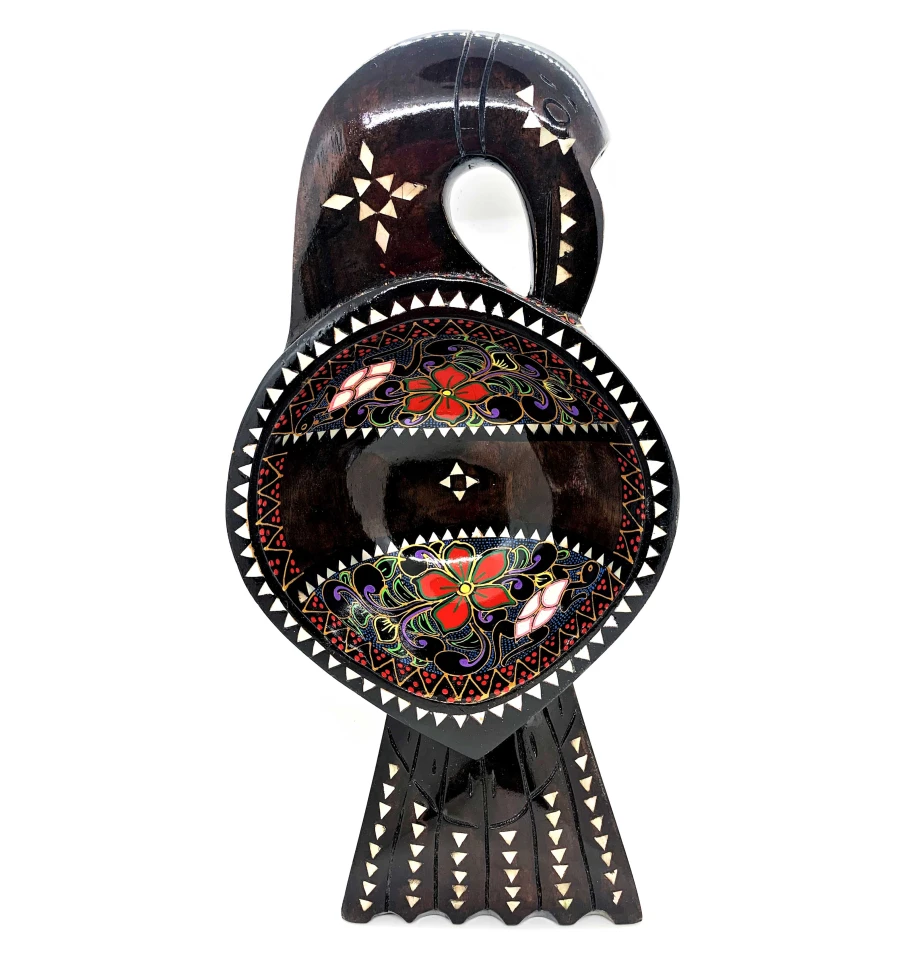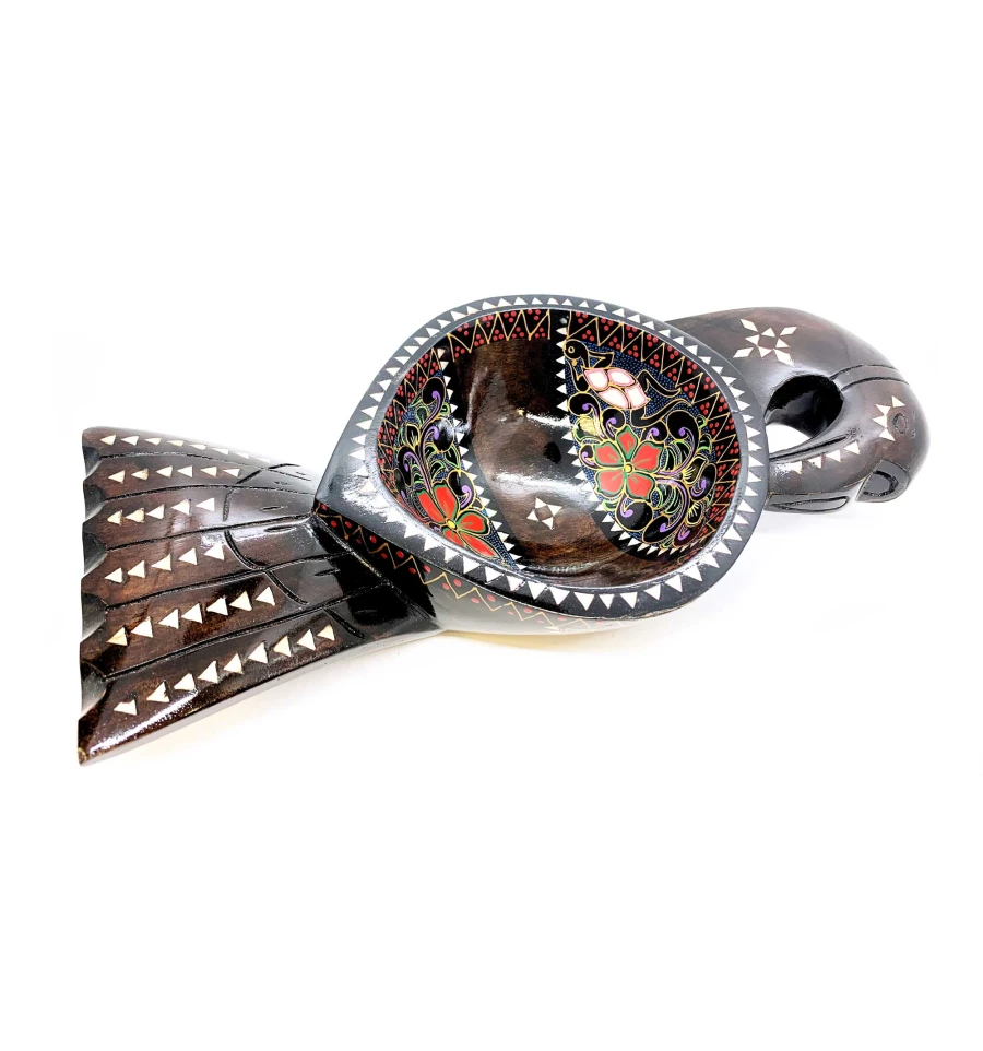 Страва виконана у формі птиці та має розміри 34х16х7 см. Коричневий колір дерева у поєднанні з яскравими квітами розпису створюють чудовий контраст, який приваблює погляд. Інкрустація з перламутру доповнює унікальність та елегантність виробу.