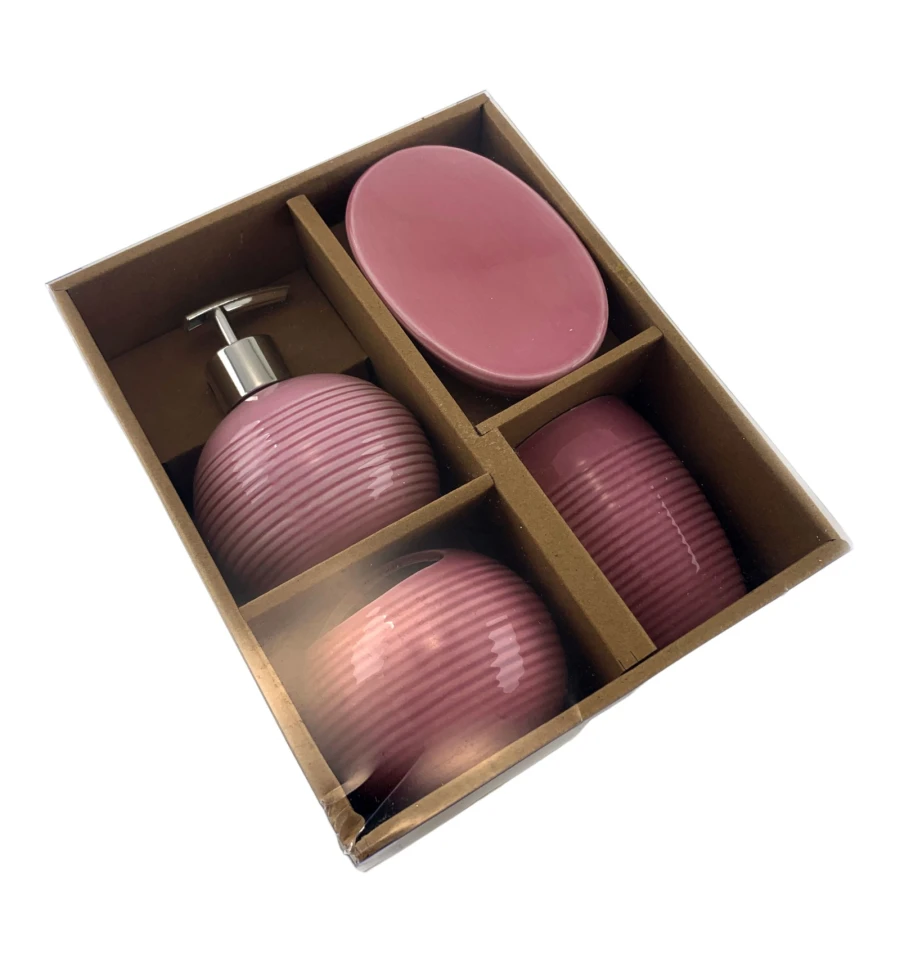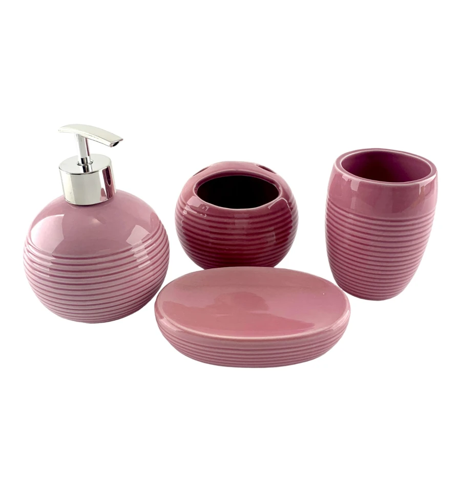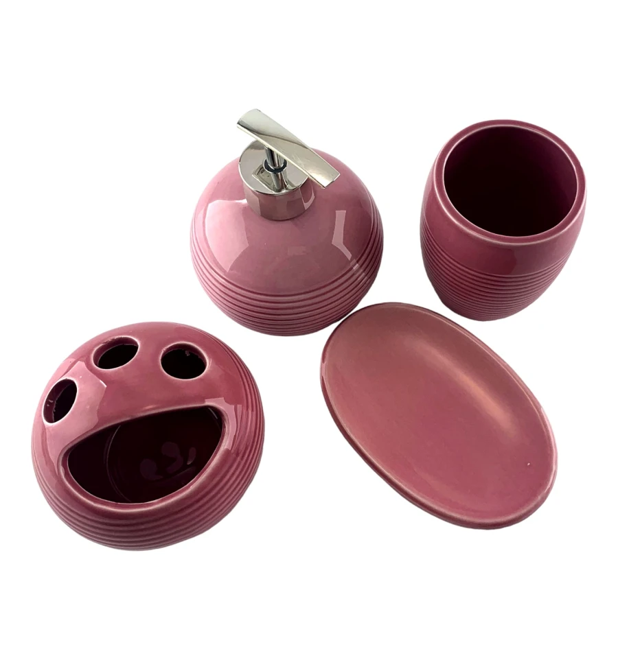 Цей рожевий керамічний набір не тільки надасть вашій ванній кімнаті вишуканого вигляду, але й зробить її більш організованою та функціональною. Він також може стати чудовим подарунком для ваших близьких або друзів, додаючи нотку краси та практичності в їхнє повсякденне життя.