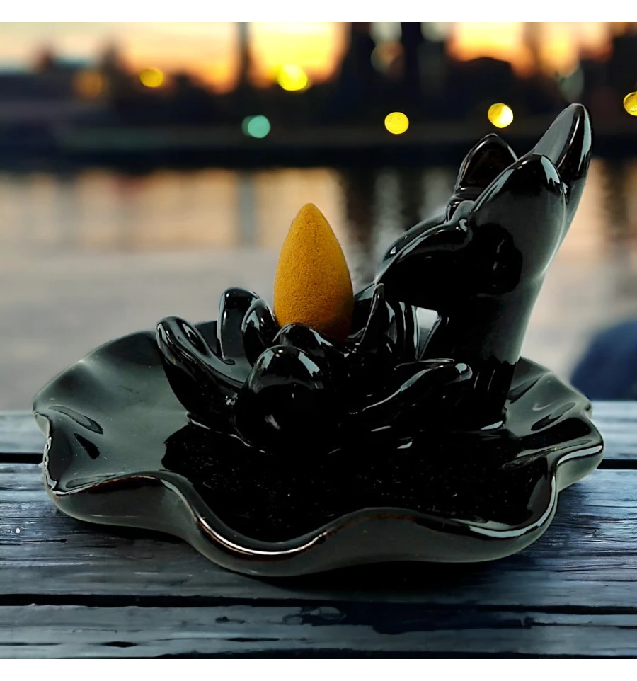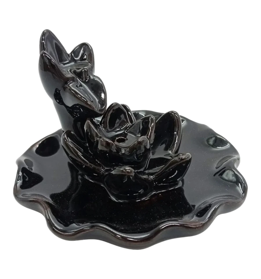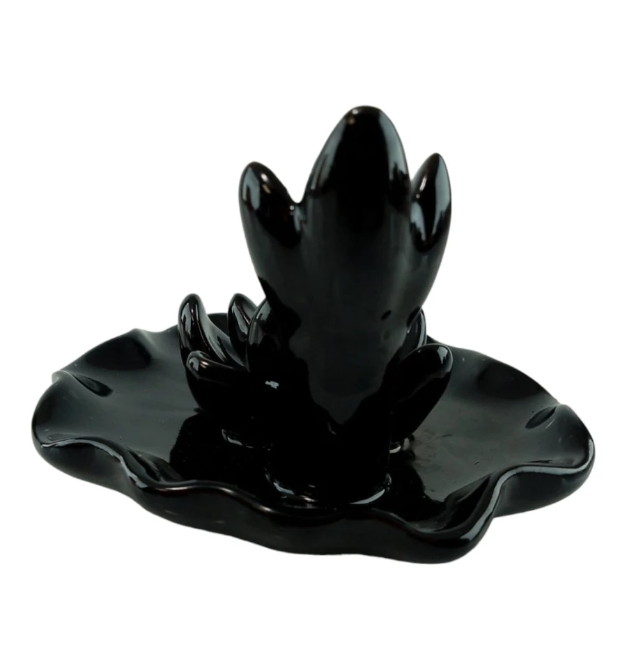 Чорно-коричнева підставка у формі латаття, обрамлена деталлю у вигляді витонченої квітки, надає їй не тільки функціональності, а й естетичної привабливості. Цей дизайн втілює в собі красу та дух східної культури.
