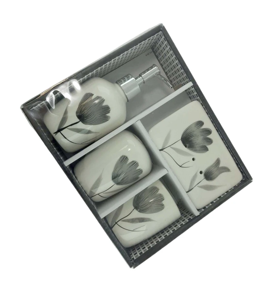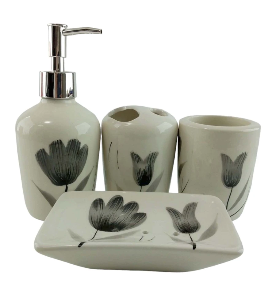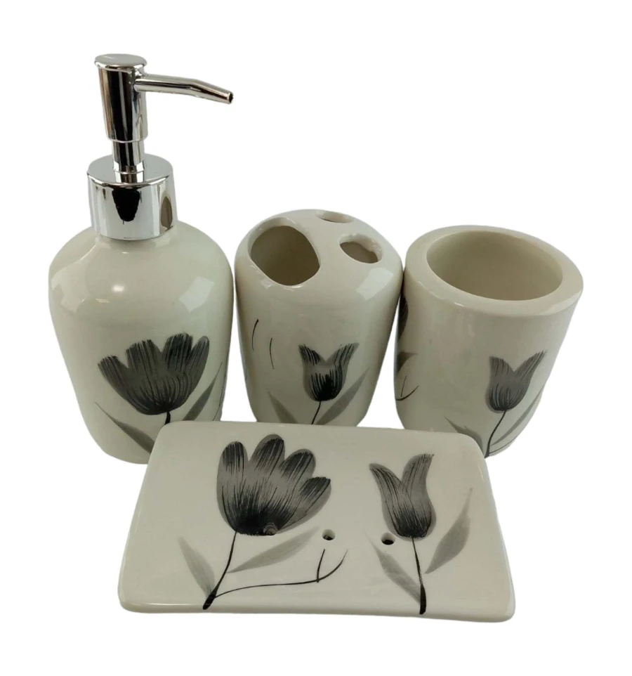 З чарівним набором аксесуарів для ванної кімнати всі предмети будуть на своїх місцях. У керамічний набір входить дозатор для рідкого мила, склянка, органайзер для зубних щіток, мильниця.