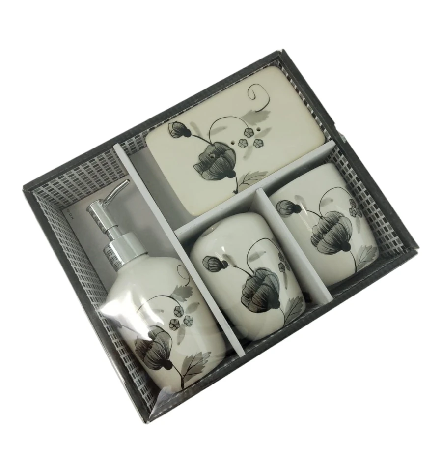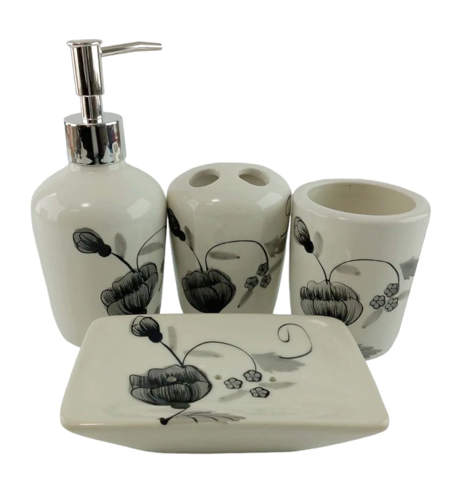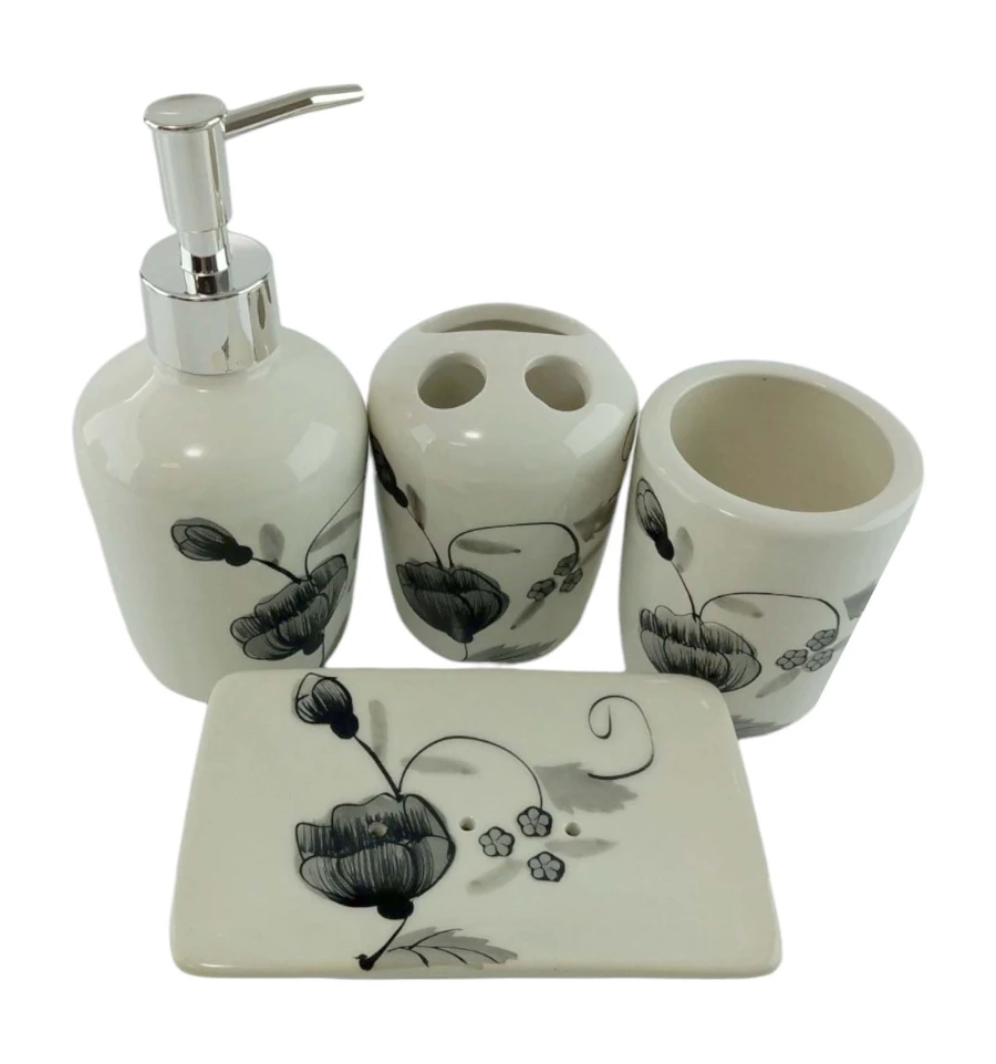 З чарівним набором аксесуарів для ванної кімнати всі предмети будуть на своїх місцях. У керамічний набір входить дозатор для рідкого мила, склянка, органайзер для зубних щіток, мильниця.