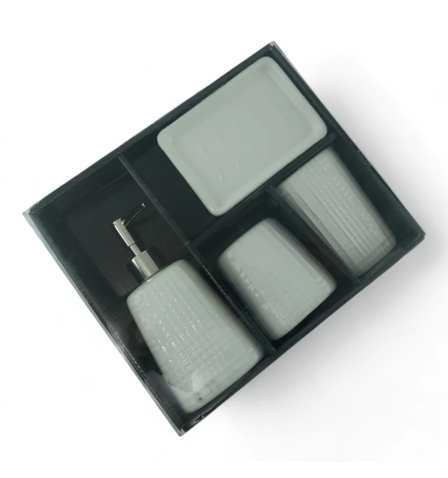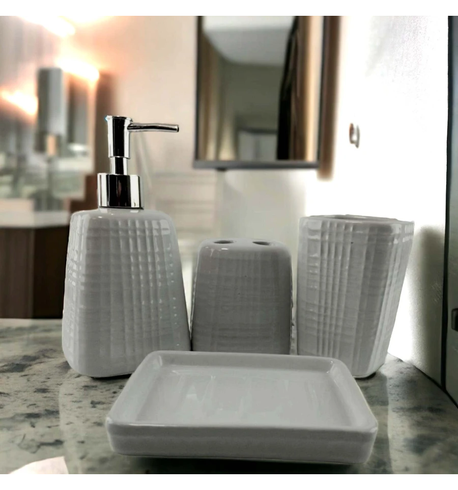 З чарівним набором аксесуарів для ванної кімнати всі предмети будуть на своїх місцях. У керамічний набір входить дозатор для рідкого мила, склянка, органайзер для зубних щіток, мильниця.