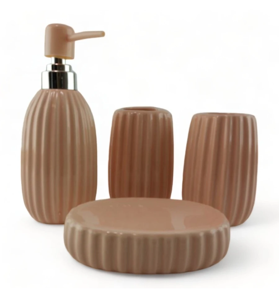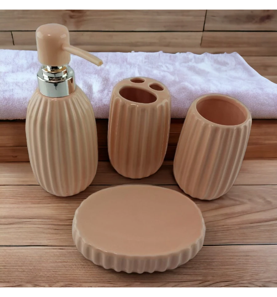З чарівним набором аксесуарів для ванної кімнати всі предмети будуть на своїх місцях. У керамічний набір входить дозатор для рідкого мила, склянка, органайзер для зубних щіток, мильниця.