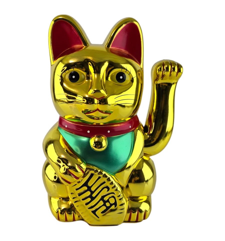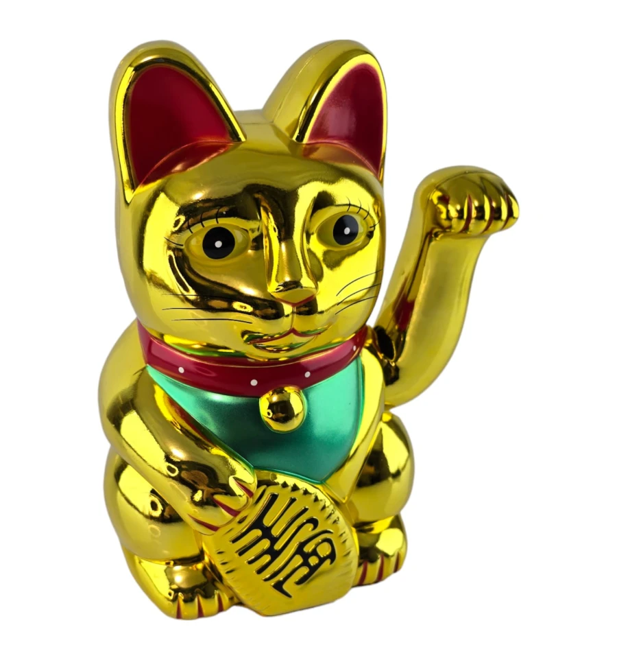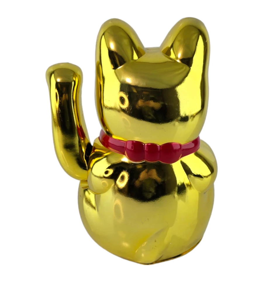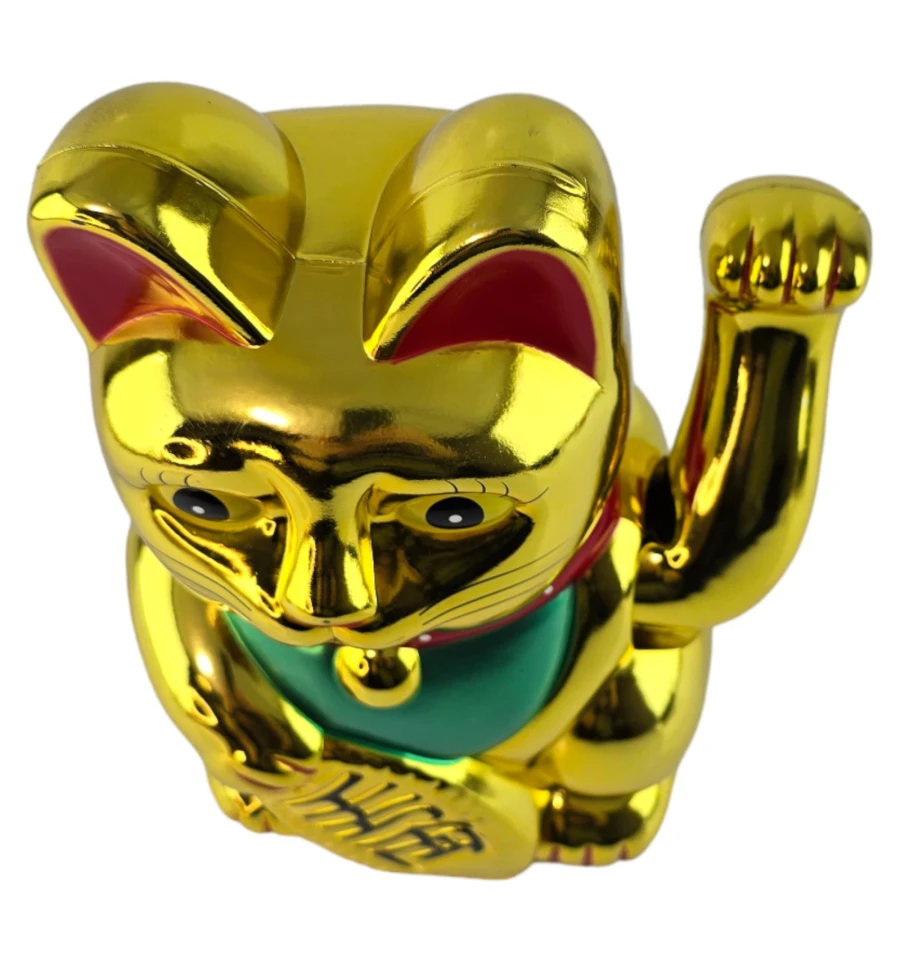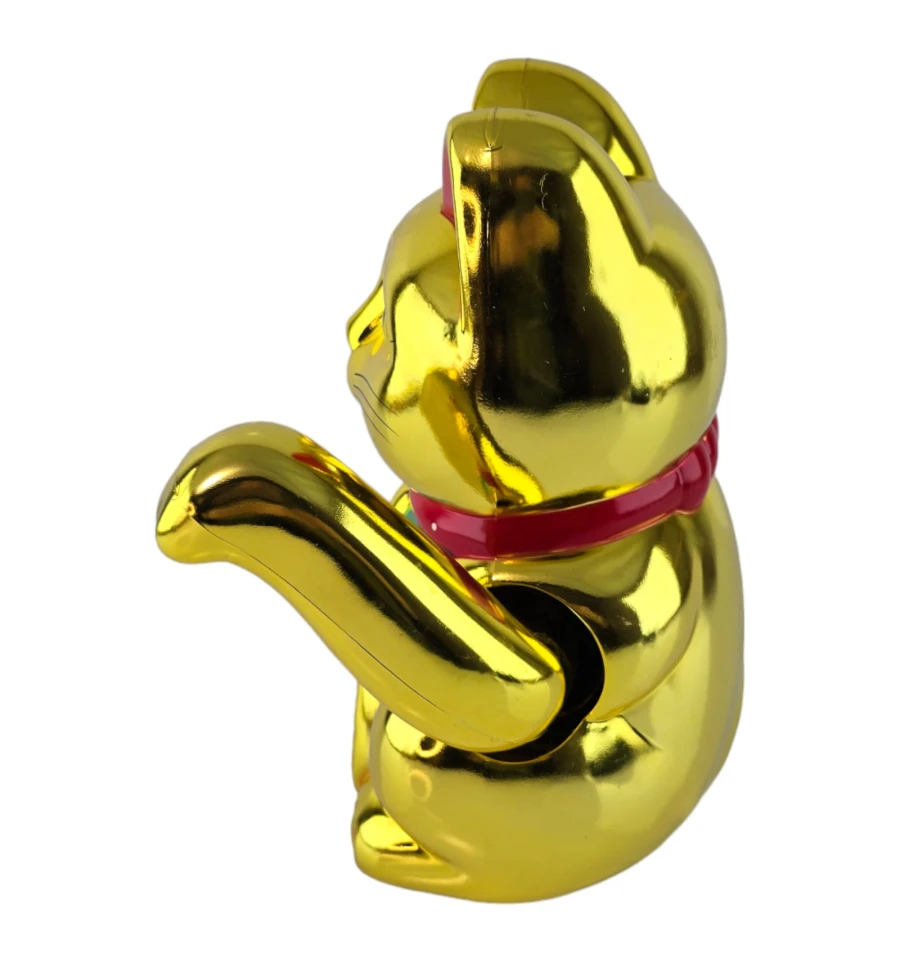 Золота кішка "Манекі-Неко" - це не просто статуетка, а ваш особистий талісман удачі. Працюючи на батарейках, ця миловидна кішка безперервно махає лапкою, приносячи у ваш будинок потік позитивної енергії та процвітання.