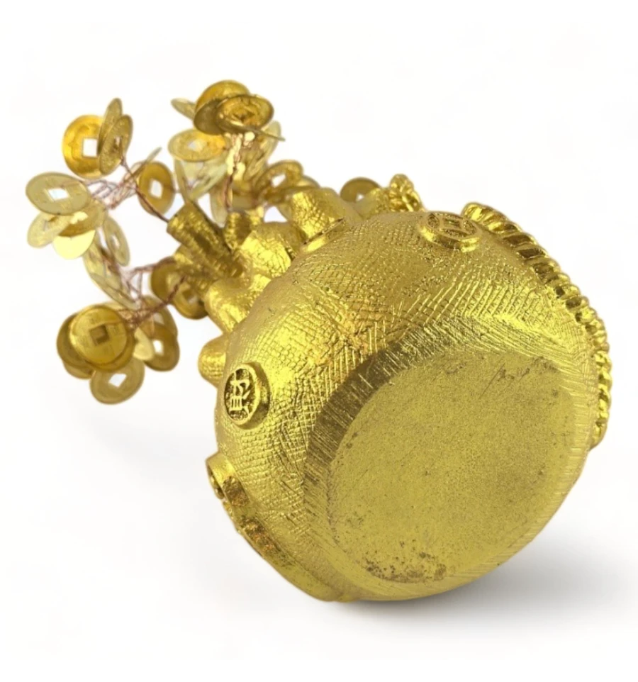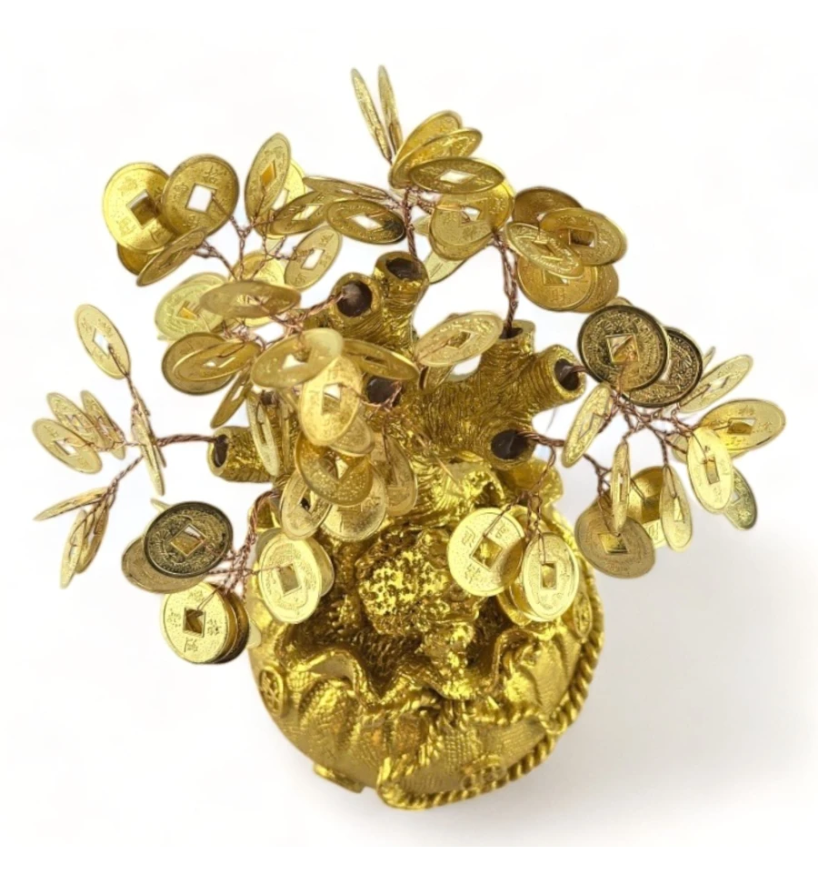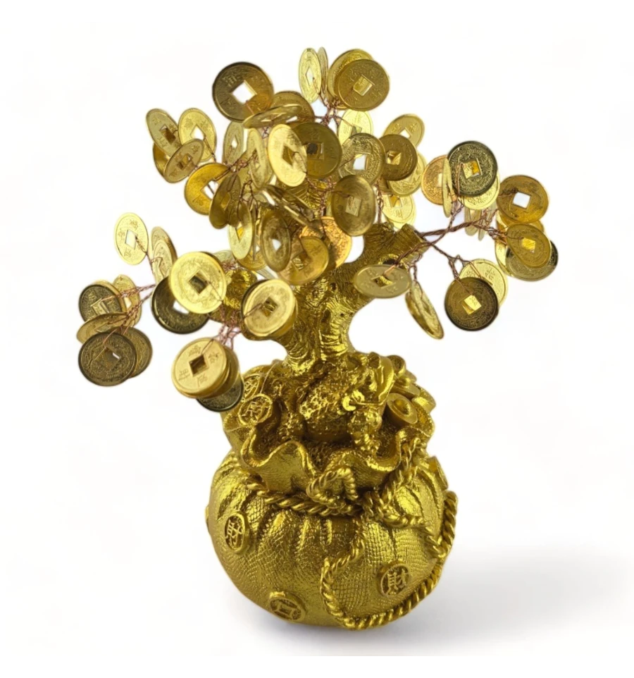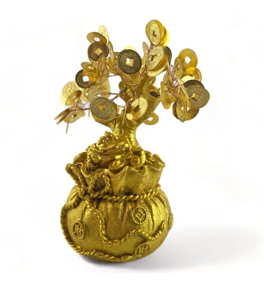 Це грошове дерево втілює гармонію природи та багатства. Вишуканий золотистий колір надає йому шляхетності, а форма мішечка нагадує про те, як дбайливо та обережно потрібно ставитися до свого фінансового зростання. Жаба, що сидить поруч із монетою, символізує залучення багатства та удачі.