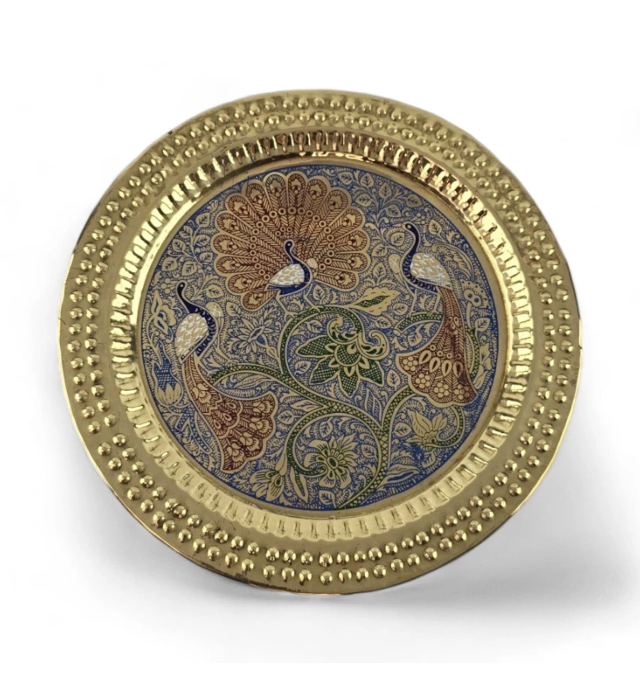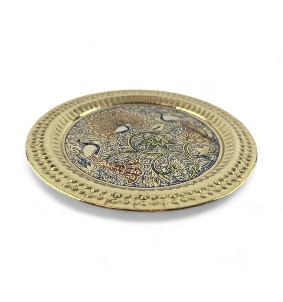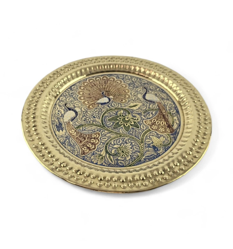 Наші настінні бронзові тарілки – це не просто предмети інтер'єру, це джерела натхнення та естетичної насолоди. Одна з них – тарілка із зображенням трьох чудових павичів, які плавно розпускають своє пір'я на тлі глибокого синього неба.