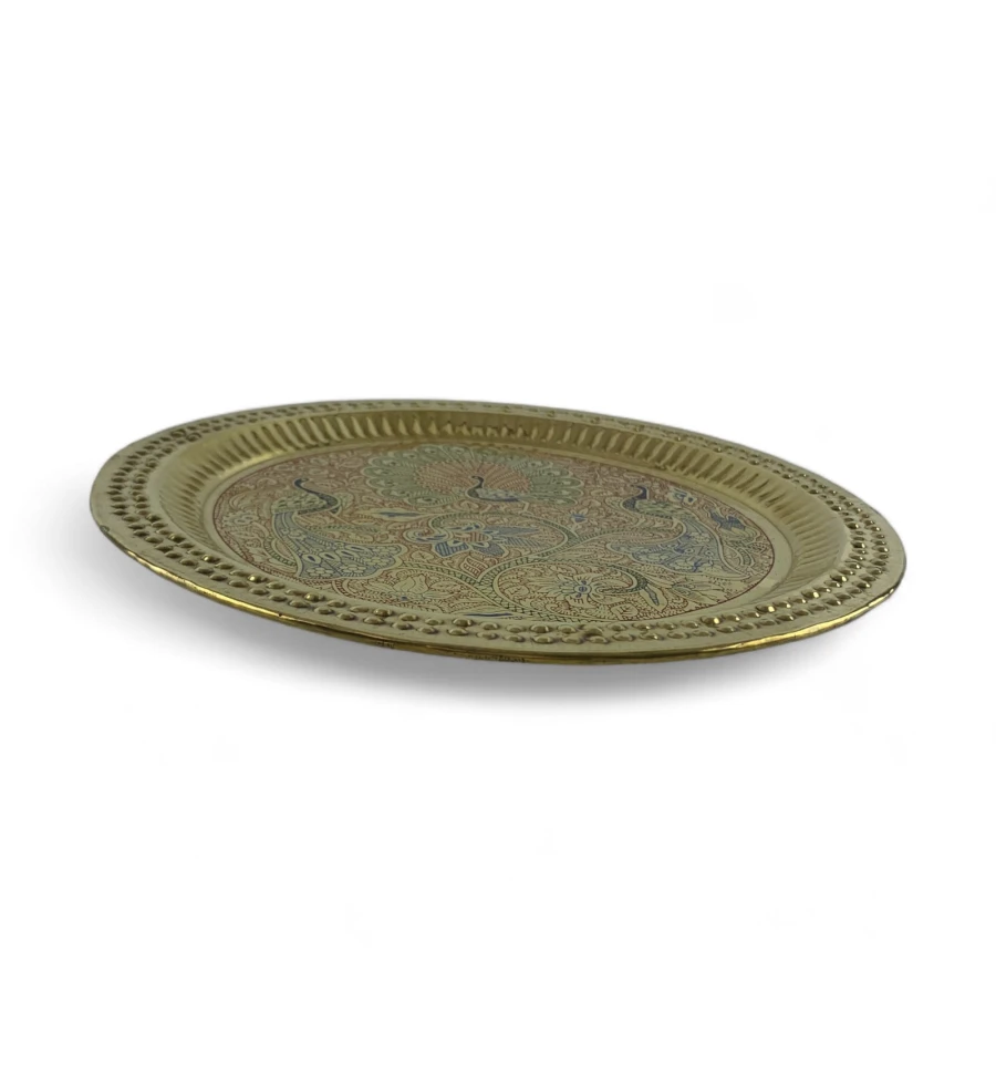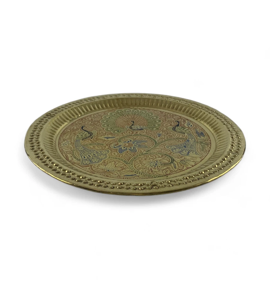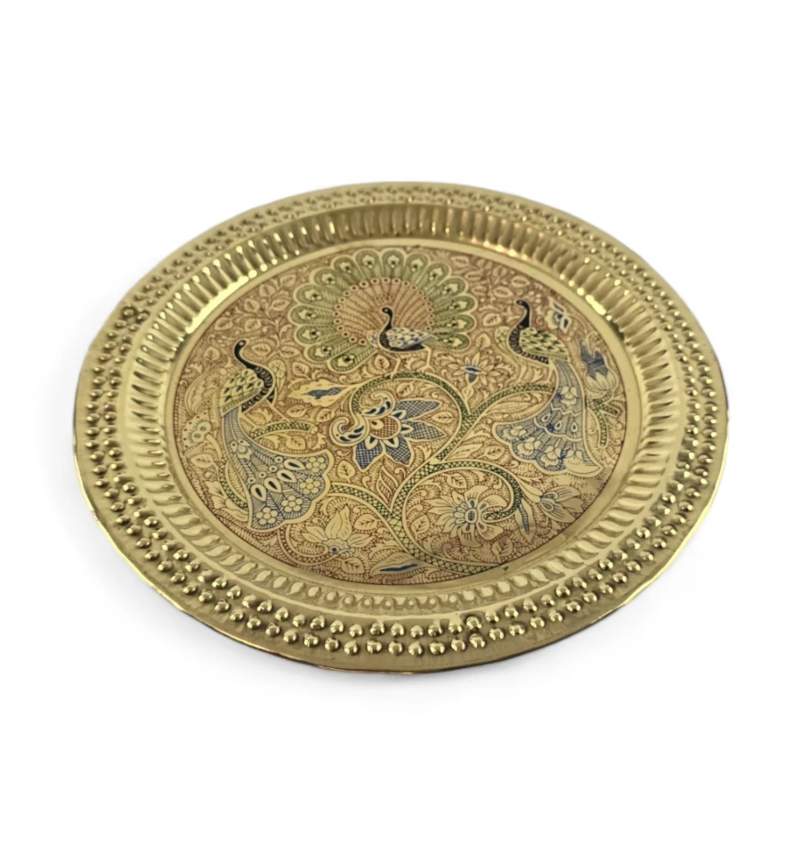 Наші настінні бронзові тарілки – це не просто предмети інтер'єру, це джерела натхнення та естетичної насолоди. Одна з них – тарілка із зображенням трьох чудових павичів, які плавно розпускають своє пір'я на червоному тлі.
