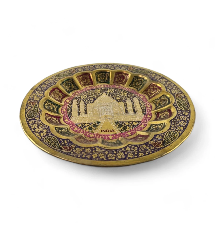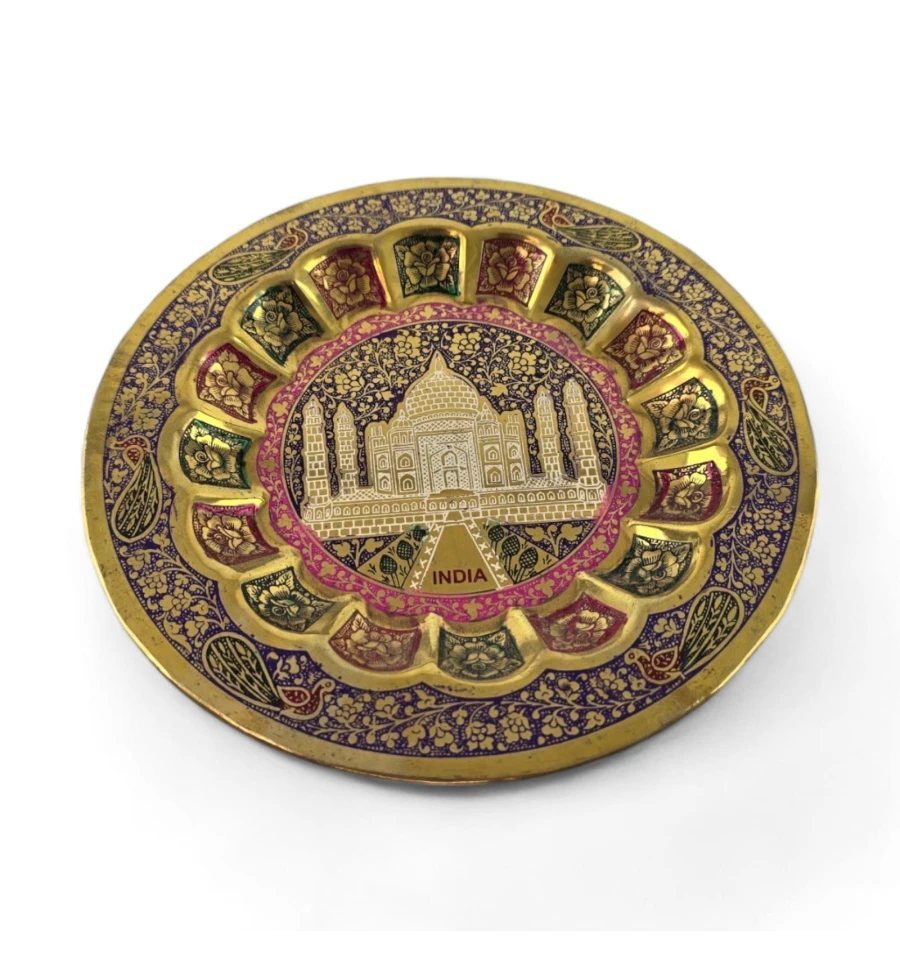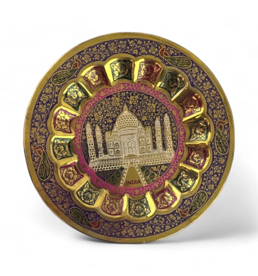 Наша бронзова настінна тарілка – це не просто прикраса для стін, це вікно у світ великих історичних пам'яток. Уявіть собі величний Тадж-Махал, що височіє на тлі глибокого фіолетового неба, наче занурений у містичну атмосферу.