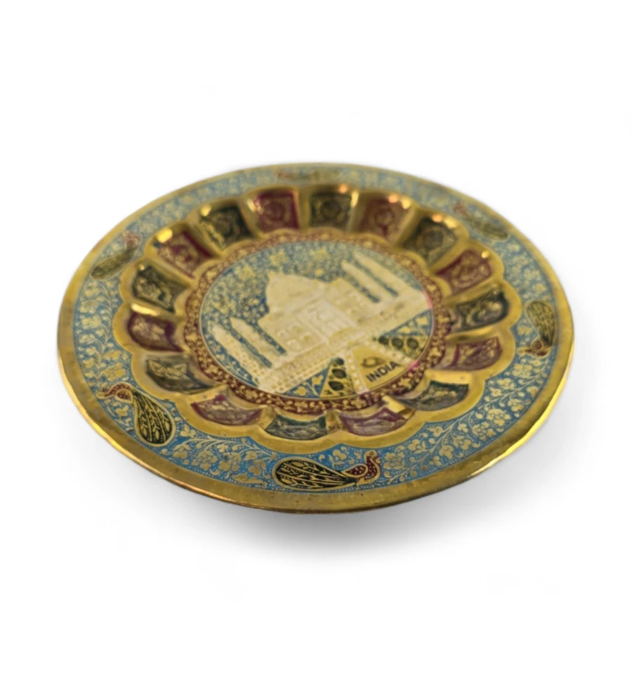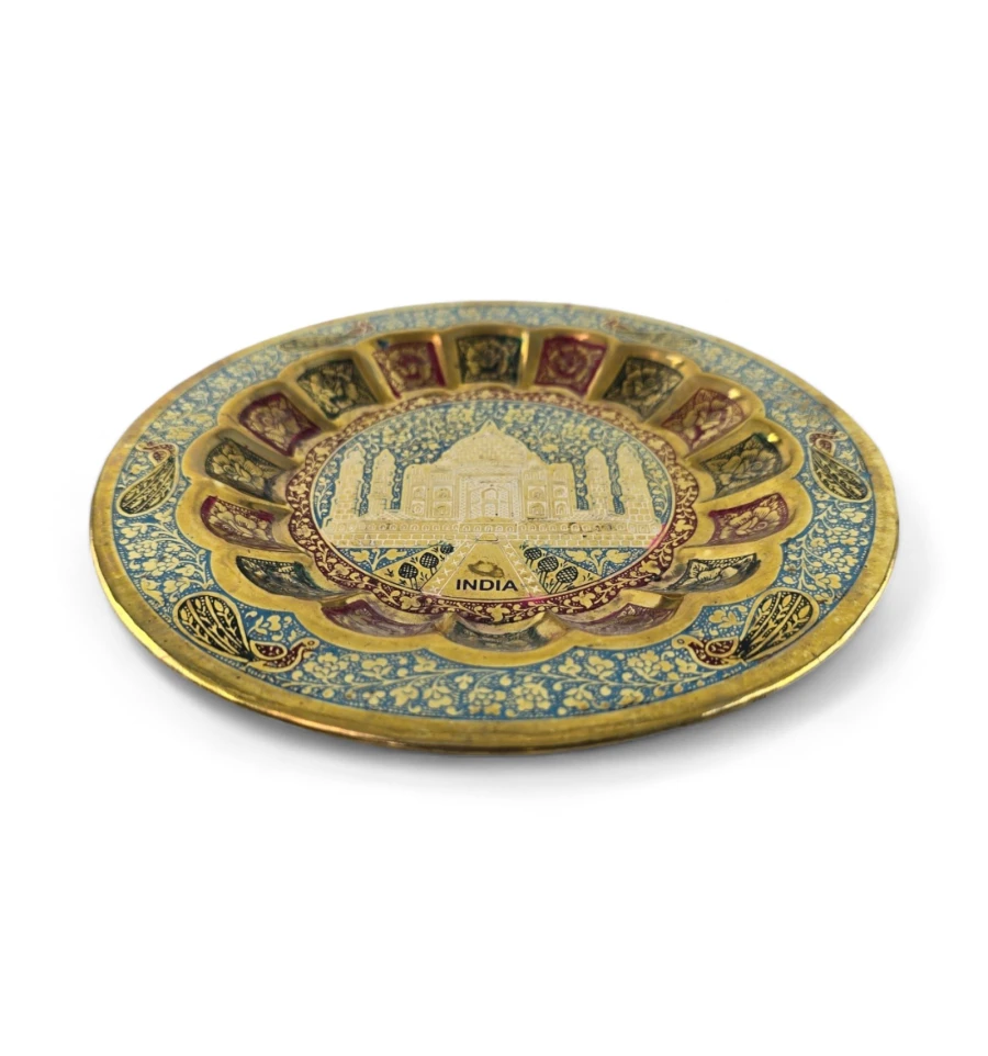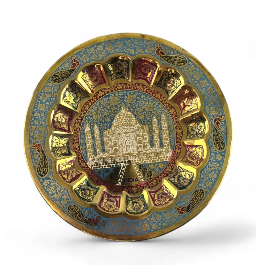 Наша бронзова настінна тарілка – це не просто прикраса для стін, це вікно у світ великих історичних пам'яток. Уявіть собі величний Тадж-Махал, що височіє на тлі глибокого неба, наче занурений у містичну атмосферу.