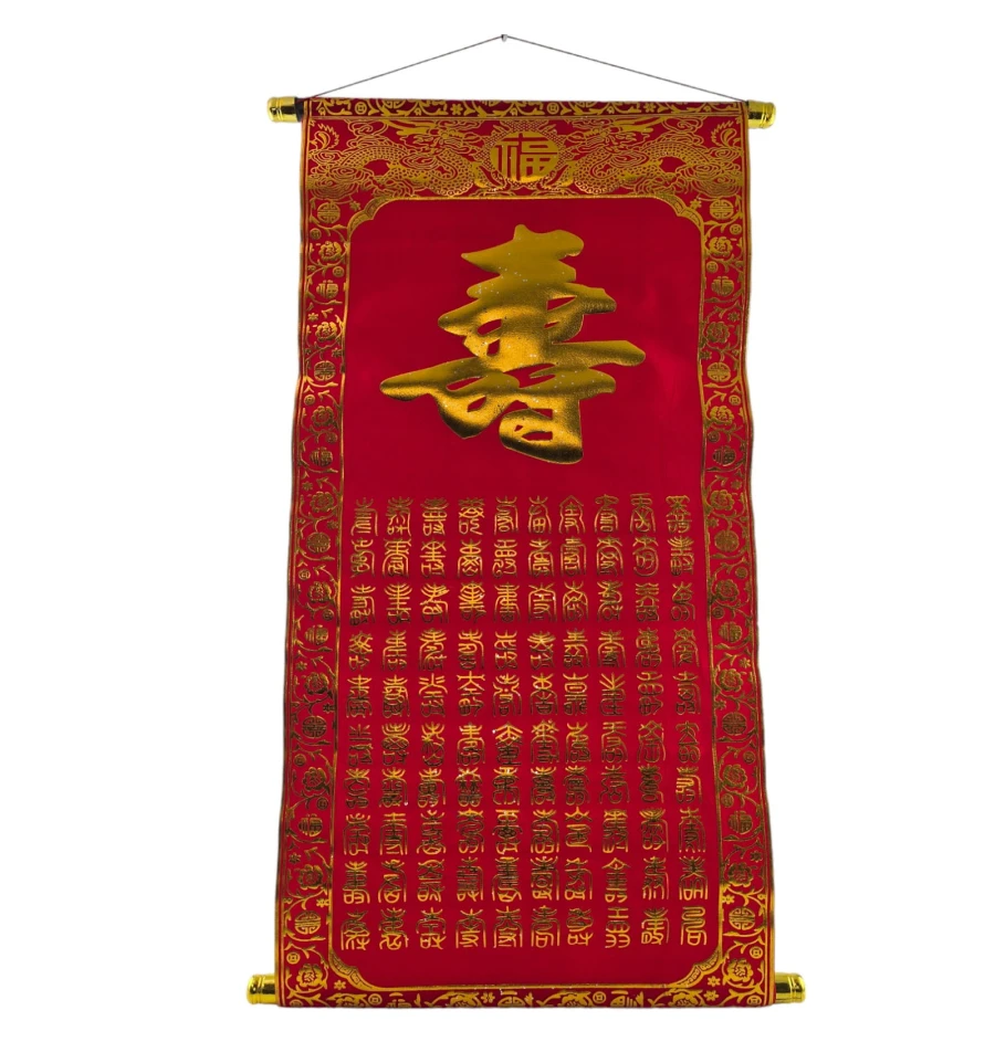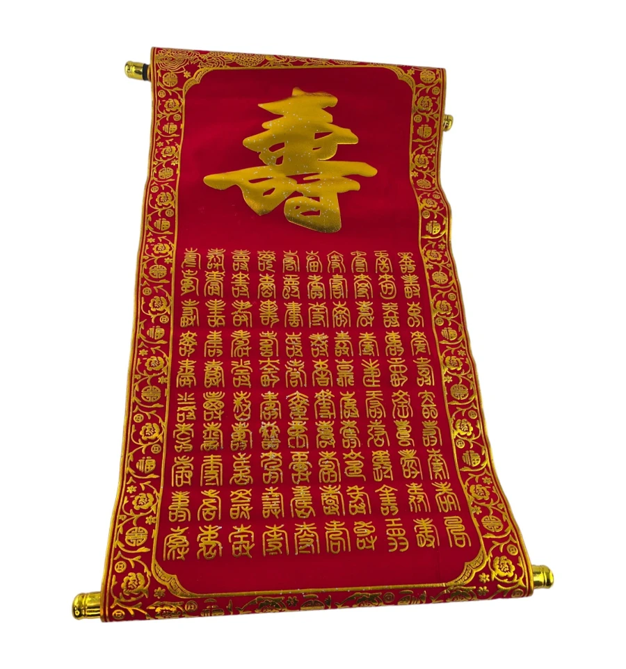 Це панно виконане в глибокому червоному відтінку, що символізує стійкість та енергію життя. Ієрогліфи, вишукано виведені золотистим кольором, несуть у собі мудрість і таємниці віків, а їхній переклад означає "Довговічність" – нагадування про цінність часу та нев'янучу силу духу.