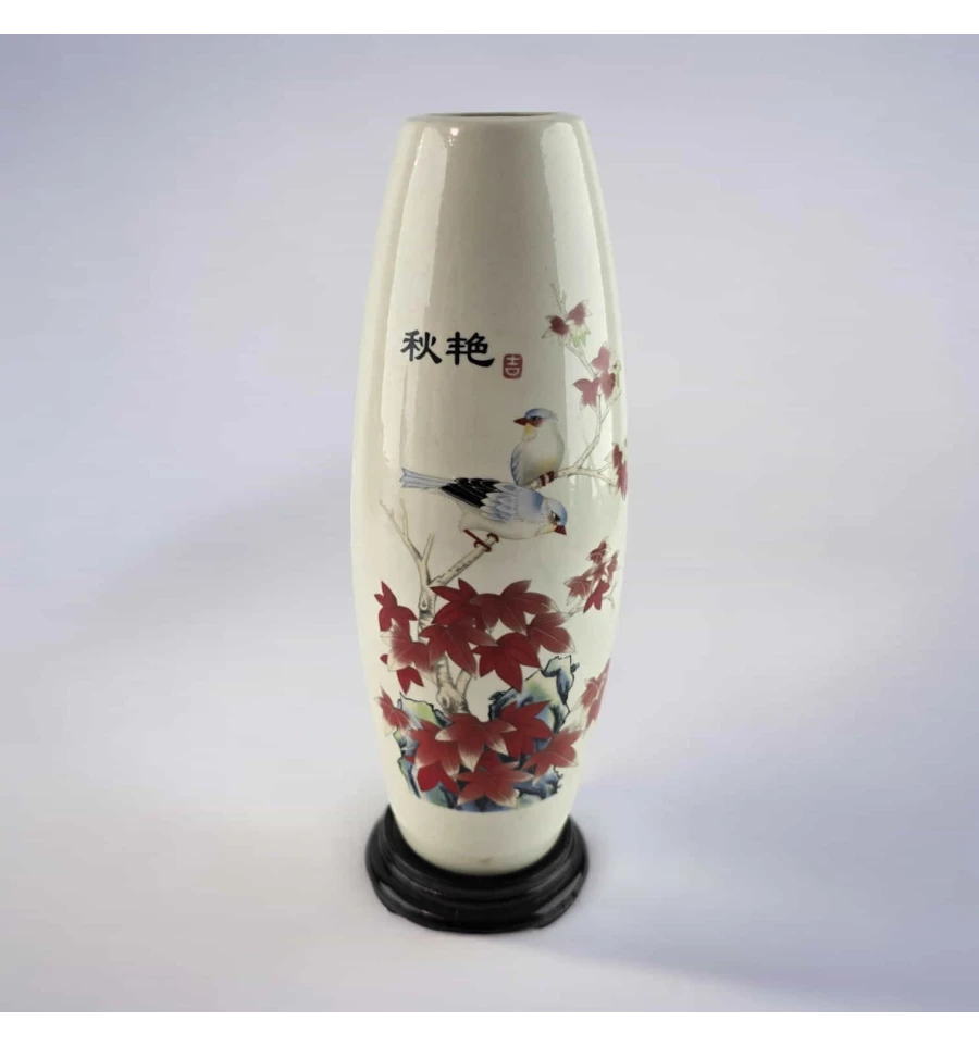 Пропонуємо витончену фарфорову вазу "Птахи на гілці", яка стане витонченим акцентом у вашому інтер'єрі. Ваза прикрашена вишуканим малюнком, що зображує птахів, що затишно розташувалися на гілці з яскравими червоними квітами.