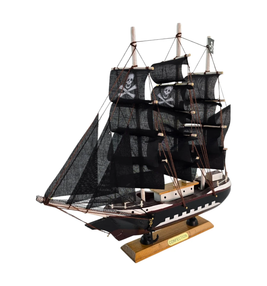 Настільна модель вітрильника з чорними піратськими вітрилами - ефектний акцент для кабінету, вітальні або дитячої. Корабель виконаний з дерева з тканинними вітрилами та встановлений на підставці, тому його зручно розміщувати на полиці або на робочому столі. Відмінний подарунок любителям морської тематики, подорожей та історії флоту.
