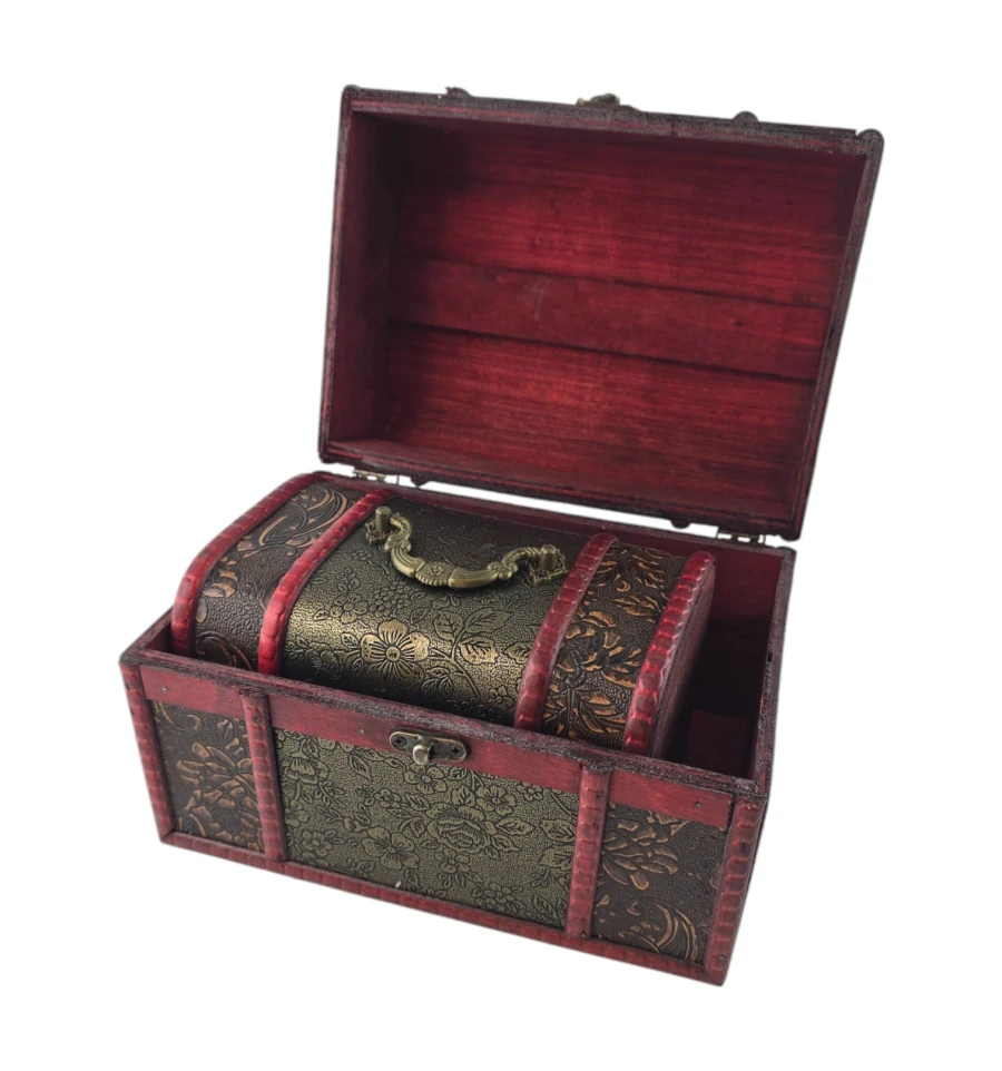 Набір із трьох скриньок "Тріада Тайн" - це не тільки чудовий елемент декору, а й практичне рішення для зберігання ваших скарбів. Кожна скринька виконана з дерева з майстерним декоративним оздобленням, яка надає виробу вінтажного та вишуканого вигляду. Візерунковий малюнок і глибокий червоний відтінок створюють атмосферу таємниці та розкоші. Скриньки ідеально підходять для зберігання прикрас, листів, пам'ятних сувенірів та інших дорогих серцю речей. Цей набір додасть нотку витонченості вашому інтер'єру та підкреслить ваш смак.