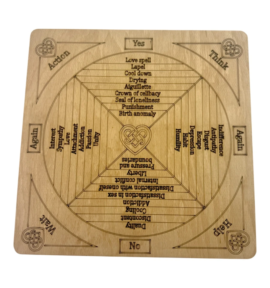 Таблиця любовної магії - це інструмент для роботи з маятником, який допоможе визначити вашу сумісність із потенційним партнером, дізнатися справжні почуття, залучити кохання чи зберегти гармонійні стосунки. Таблиця має розмір 26х26х0,8 см і виготовлена з дерева, покритого лляною олією з бджолиним воском, що надає їй натурального вигляду та захищає від вологи. На таблиці зображені різні символи, які представляють різні енергії та стани, а також інструкції для використання маятника та таблиці у роботі з любовною магією. Це корисний інструмент для тих, хто цікавиться магією та хоче покращити свої стосунки чи залучити нові любовні зв'язки.