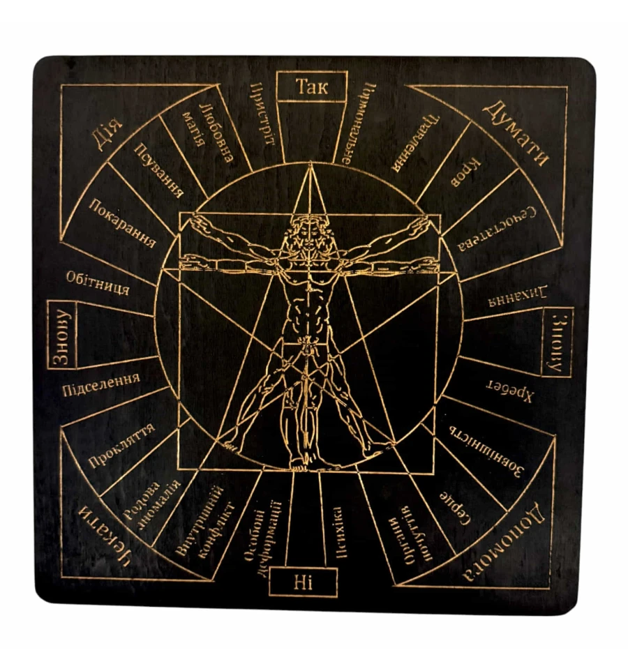 Таблиця для роботи з маятником «Магічні впливи», українською мовою, темна (26×26×0.8 см)