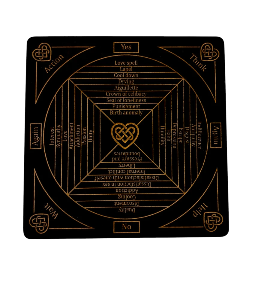 Таблиця любовної магії для роботи з маятником – це унікальний інструмент для тих, хто хоче залучити кохання у своє життя або зміцнити існуючі відносини. Таблиця виконана в темних тонах і покрита емаллю, що надає їй елегантного та стильного вигляду.