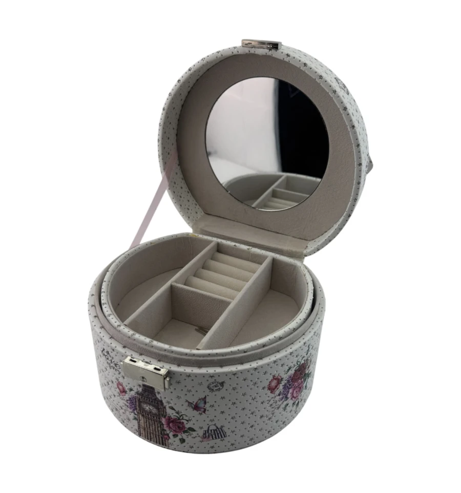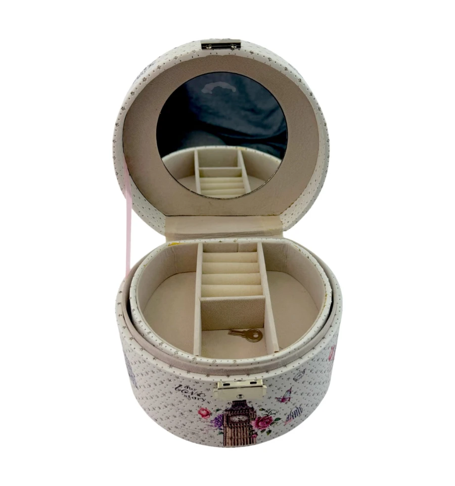 Пориньте в атмосферу старої доброї Англії з цією елегантною скринькою для прикрас. Овальна форма, яскравий принт із символами Лондона, квітами та метеликами надають виробу особливого шарму. Зручний замочок не тільки завершує образ, а й надійно зберігає ваші прикраси.