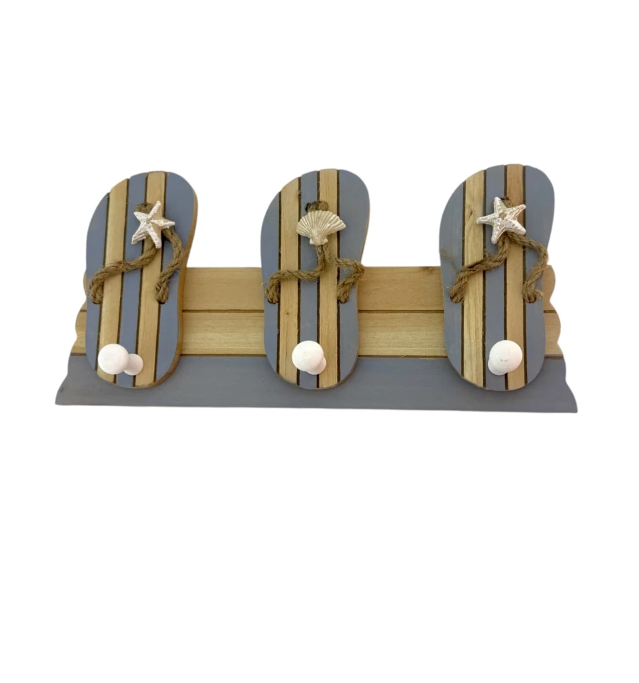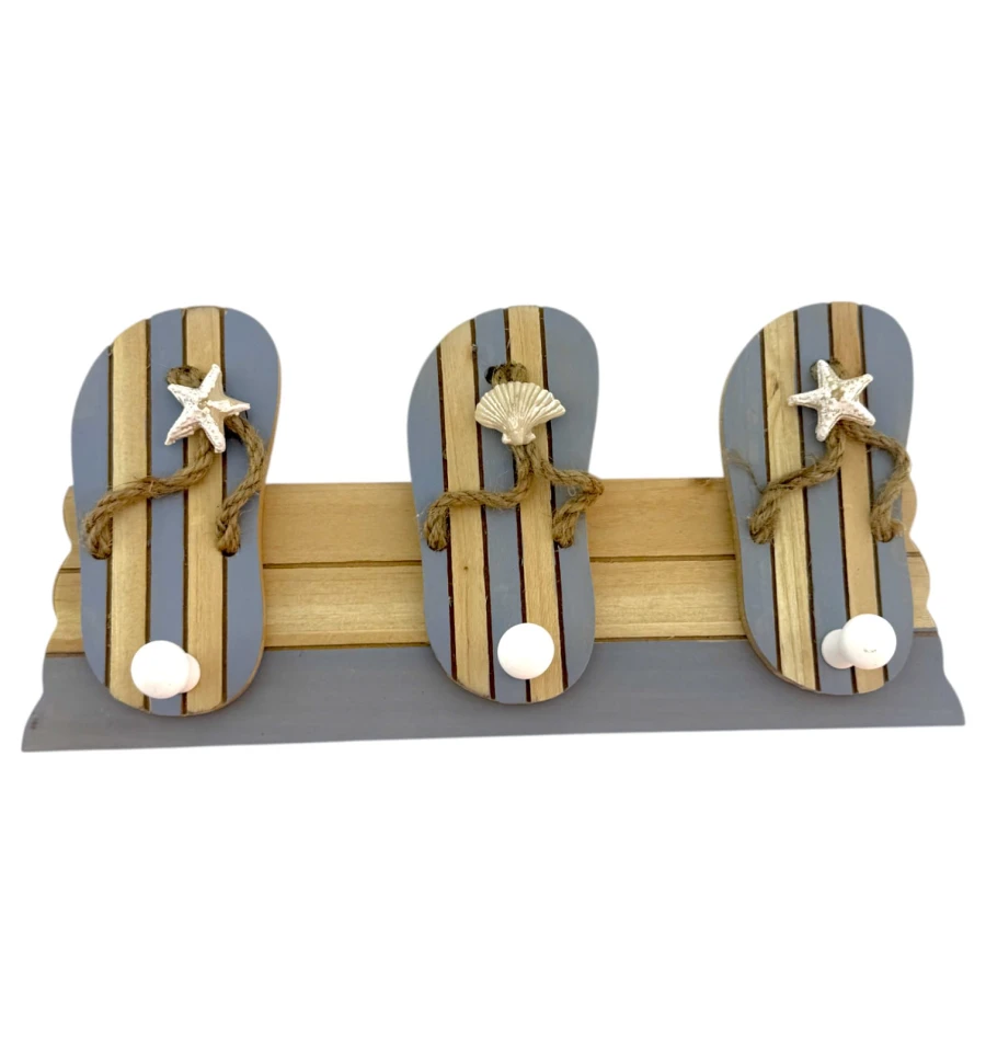 Вішалка "Пляжна" - декоративна та функціональна деталь інтер'єру, оформлена у легкому літньому стилі. На панелі зображено пляжні сланці, що створює атмосферу безтурботного відпочинку та тепла морського узбережжя.